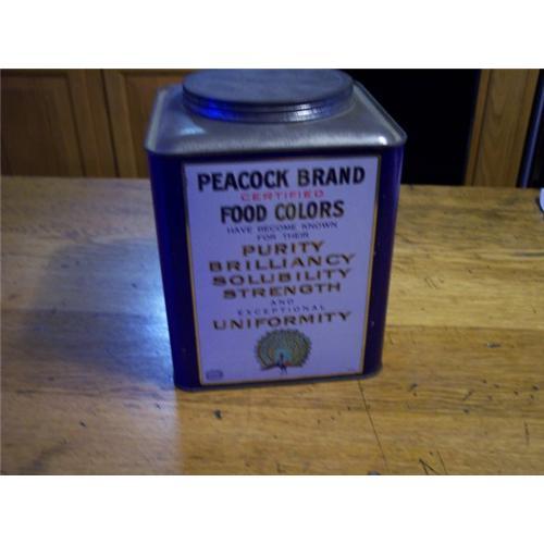 This is a tin that had Peacock Brand Food Color in itVery good condition.Stands 8" tall.