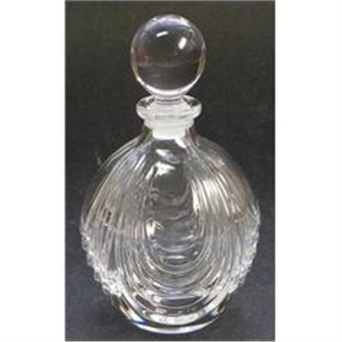 This lovely round crystal perfume bottle features a peacock feather like pattern and a clear ball ground glass fish eye stopper. Measuring 5 1/2 inches tall and in excellent condition