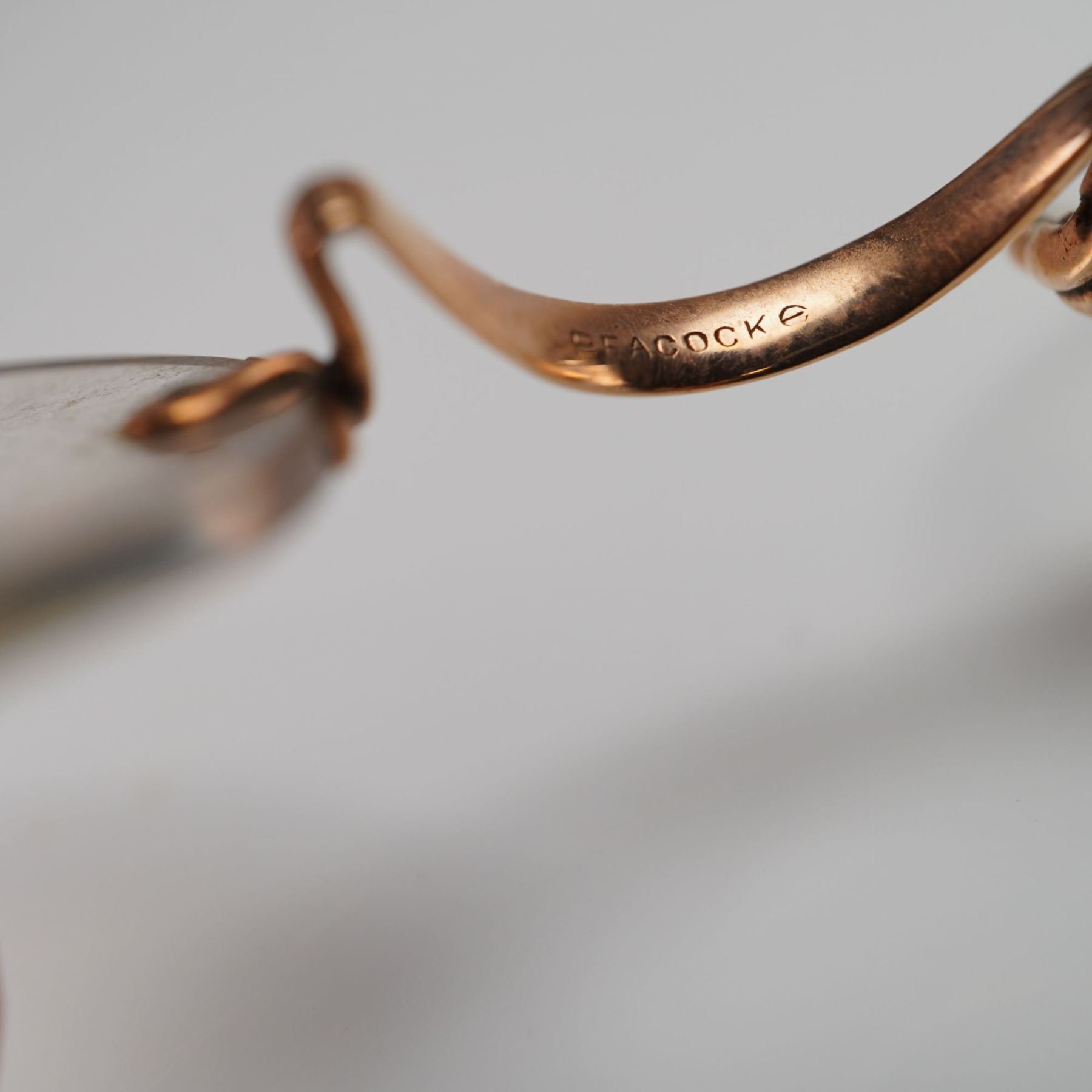 A pair of vintage rimless bifocal eyeglasses manufactured by Peacock. These spectacles are crafted from gold-filled metal featuring a solid polished finish. The design incorporates a high arched bridge and flexible cable wrap-around temples designed for a secure fit. The glass bifocal lenses are secured using a traditional screw-mount rimless hardware system. The bridge is engraved with the Peacock brand name, and a distinct hallmark is located on the hinge assembly.