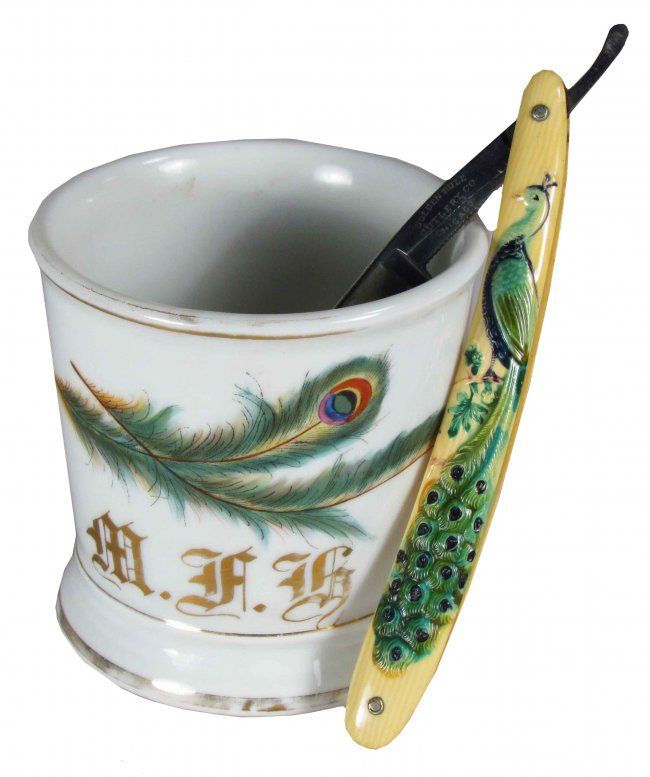 Peacock Shaving Mug and Straight Razor. M.F.G. Personal Shaving Mug with peacock feather motif. Molded celluloid with peacock. Golden Rule Cutlery Chicago. Both in excellent condition.