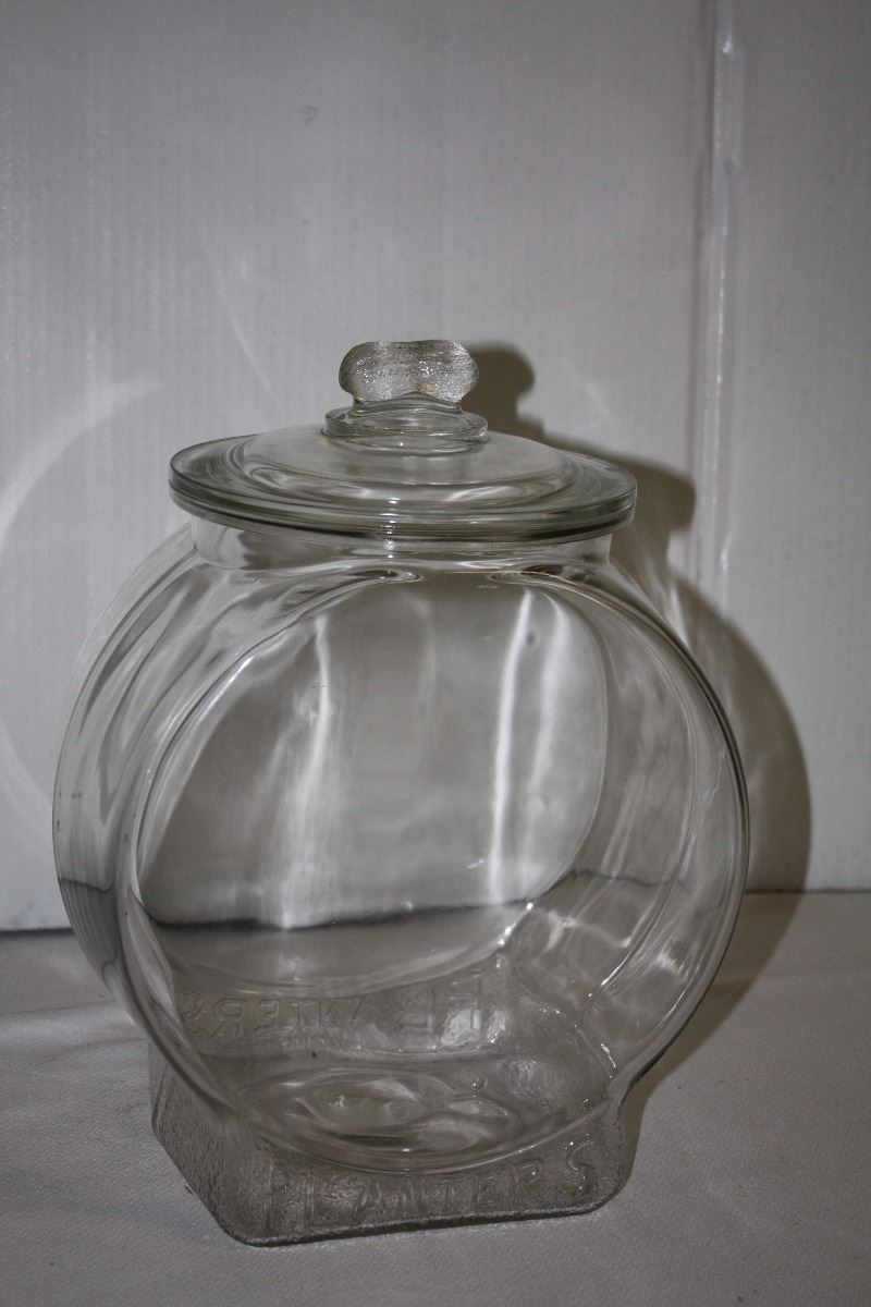 A large glass peanut jar with lid