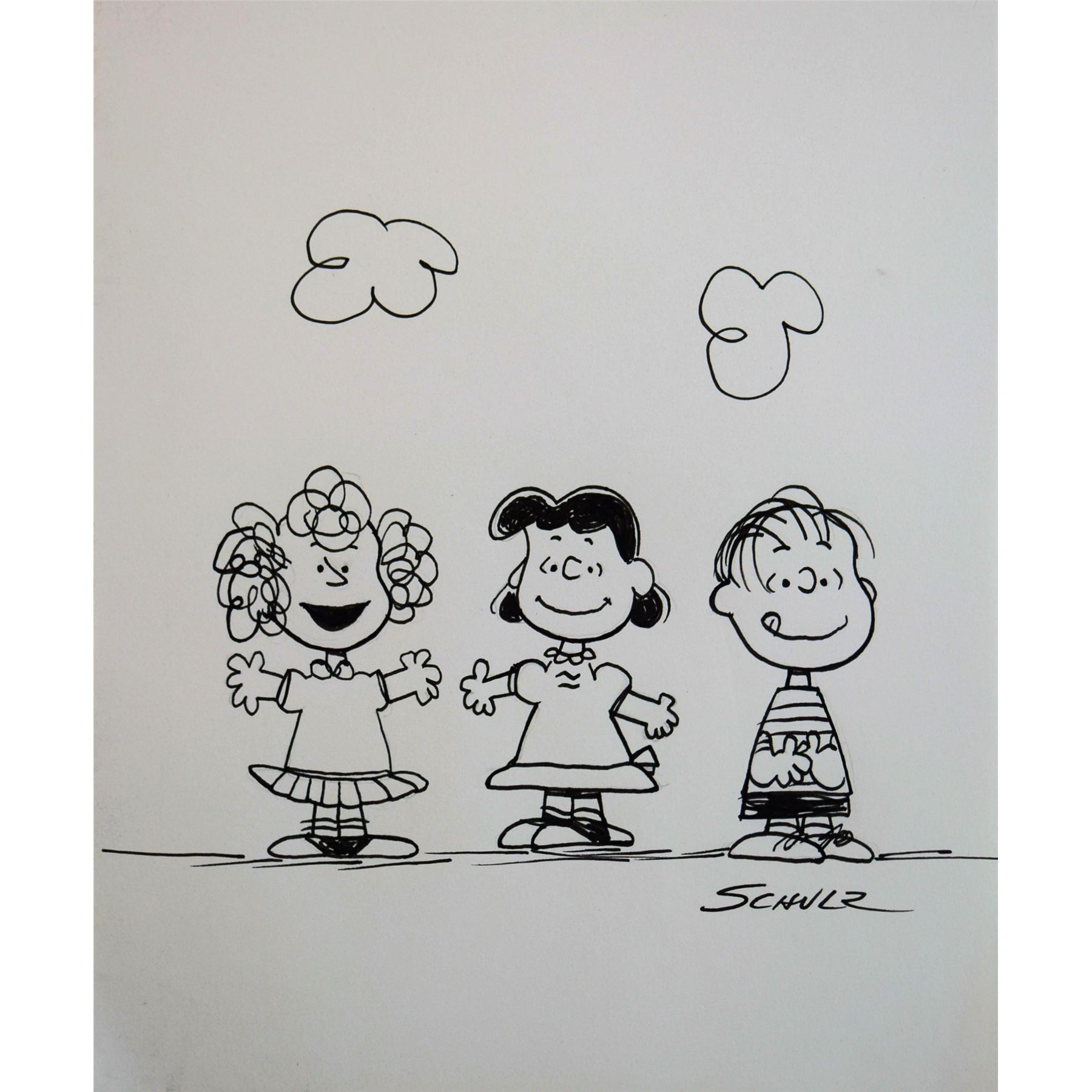 9 in. by 11 1/4 in. Black and white hand-drawn sketch by Charles Schulz of Lucy, Linus, and Frieda signed: Schulz.