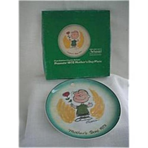 This adorable Limited First Edition Plate from the Peanuts Family Collector Series featuring Linus was designed by Charles Schultz and released by TM Schmid in 1972. Linus has a big red rose in his hand and a smile. Mother's Day 1972 is printed around bottom of plate and signed Schulz. On the back it is marked: The Peanuts Family Collector Series/Limited First Edition 1972/Mother's Day Plate/Designed and Created by Charles Schulz/1972 United Features Syndicate, Inc. with a paper label that says Made in Japan. In the original box which has some wear, the 7 1/2 inch plate has 2 tiny marks on the rim that the color did not take under the glaze. A great addition to any Collector Plate or Comic Strip Collection.<BR>SH & Ins. will be quoted after orders placed. If you have questions please contact me and thank you for looking.