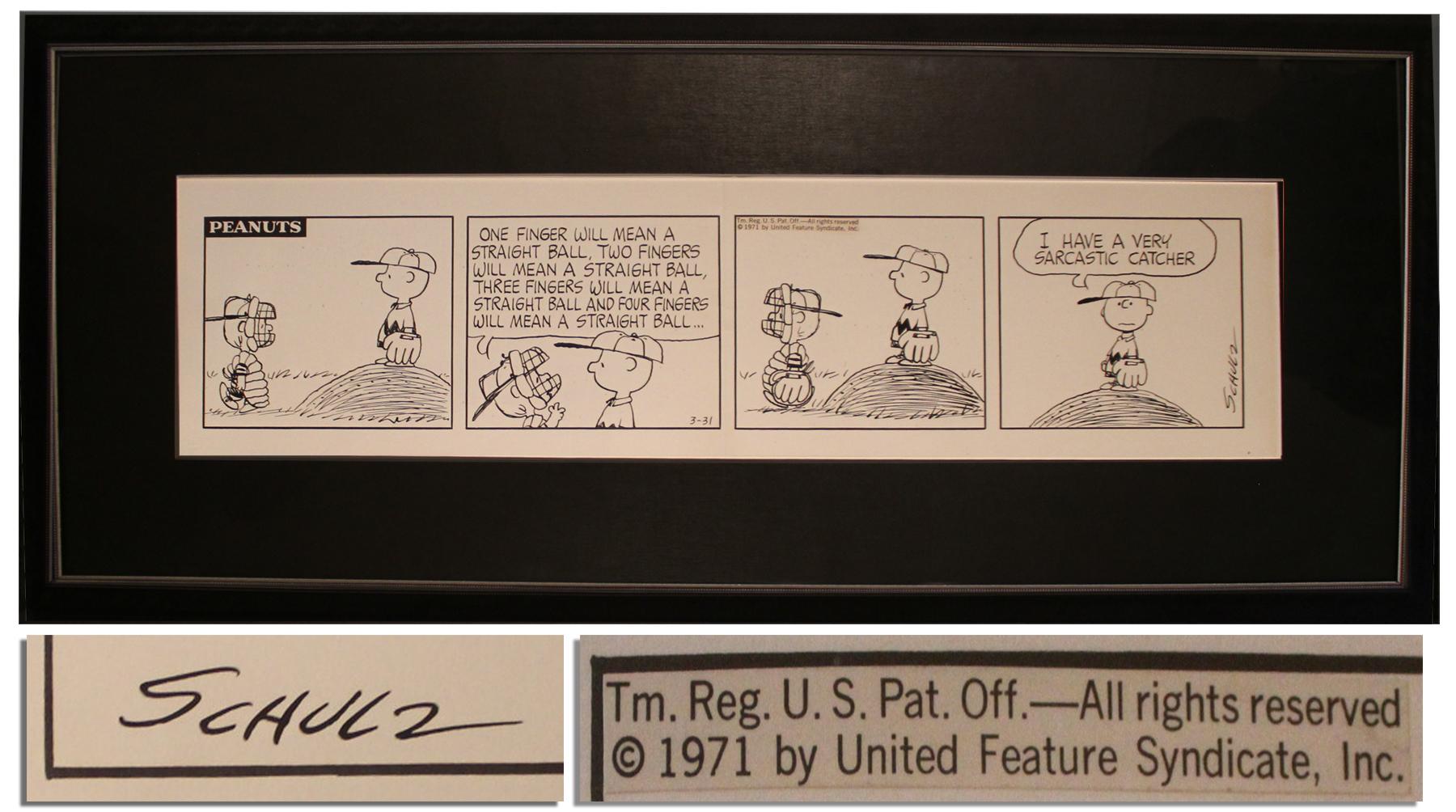 Excellent and original four-panel ''Peanuts'' strip, dated 31 March 1971 with a ''United Features Syndicate'' label notating the 1971 copyright. Signed boldly ''Schulz'' along the side of panel four. In the midst of a Peanuts baseball game, Schroeder as catcher humorously mocks Charlie Brown's pitching skills: ''One finger will mean a straight ball, two fingers will mean a straight ball, three fingers will mean a straight ball, four fingers will mean a straight ball…'' To which Charlie Brown replies, ''I have a sarcastic pitcher''. Strip measures 29'' x 7.25'' with one fold running through center, framed to an overall size of 37'' x 15.75''. Near fine condition.