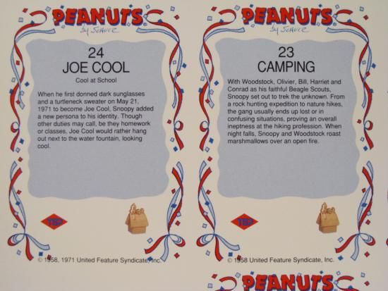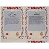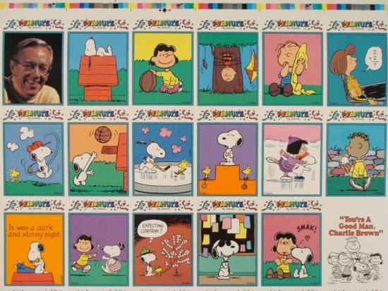 This is a full uncut sheet of Peanuts trading cards, in near mint condition, just as it came from the printing press, complete with registration marks. There were 33 cards in the set and this sheet contains 99 cards, making three complete sets. It measures 37" x 26". It is printed on a heavy "trading card" stock, with color printing front and back. The backs of the cards have descriptions of the scenes, and copyrights from what year the original was produced. The whole card sheet was produced in the mid 1990's. * These cards, which even include one of Charles Schulz, were a real tribute to the Peanuts gang, and this uncut sheet makes for a really special Peanuts collectible.