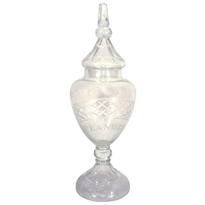 Peanuts counter display jar, fancy pedestal jar w/lid, "Peanuts" etched on center front, Exc cond, 20.5"H.