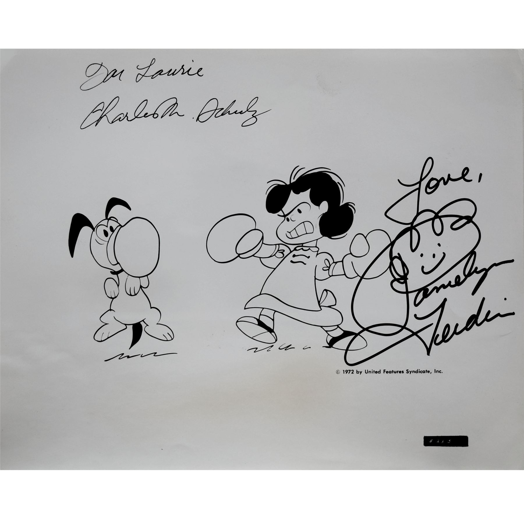 8 in. by 10 in. Cartoon Still from 1972. Signed: For Laurie Charles M. Schulz & Love, Pamelyn Ferdin