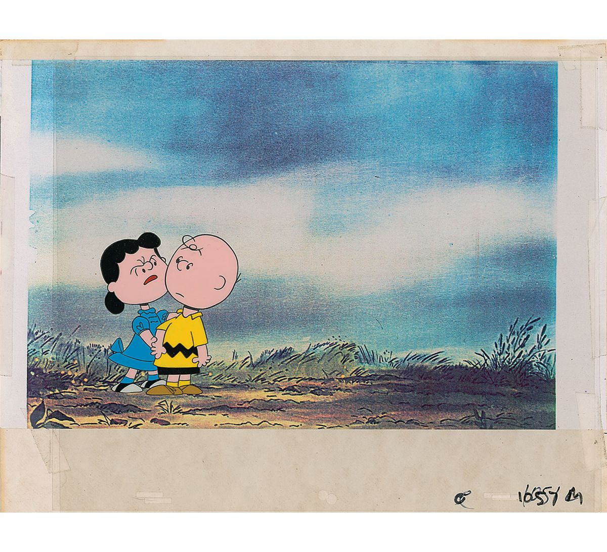 Original production cel of Charlie Brown and Lucy from a Peanuts animated program. The two-layered cel (one having only Lucy’s mouth painted on it) is placed on a color copy background. Image measures 3.25 x 4, with overall dimensions of 14 x 11. In fine condition. With a couple of animator’s notations along bottom edge