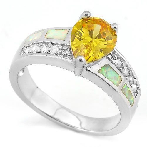 Large 3 carat, pear cut lab Yellow Sapphire with lab Fire Opal ring set in platinum over sterling silver with white sapphires for extra sparkle. Size 7. 5.0g