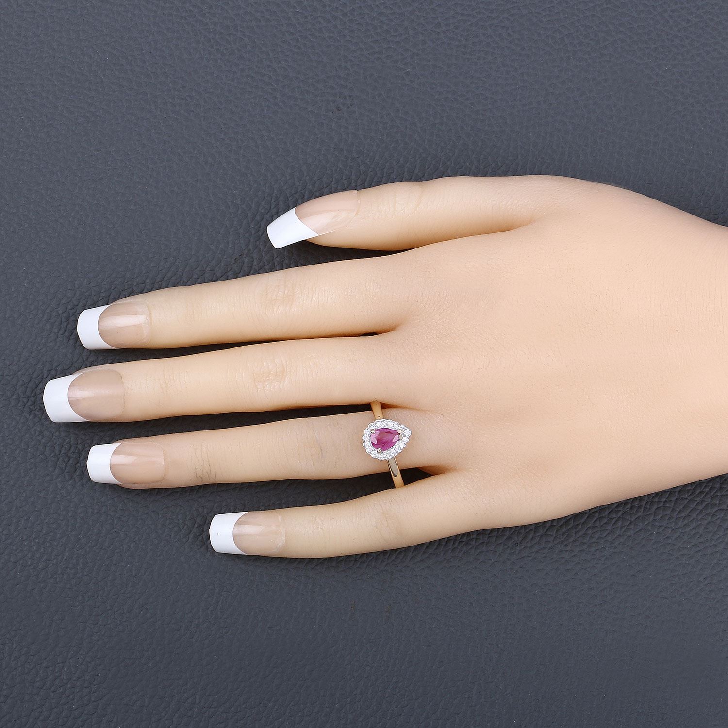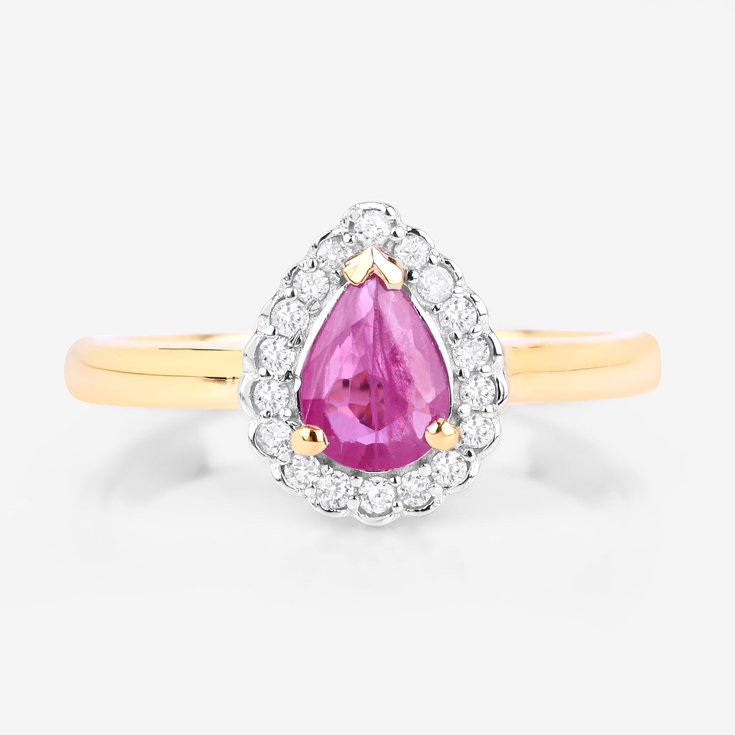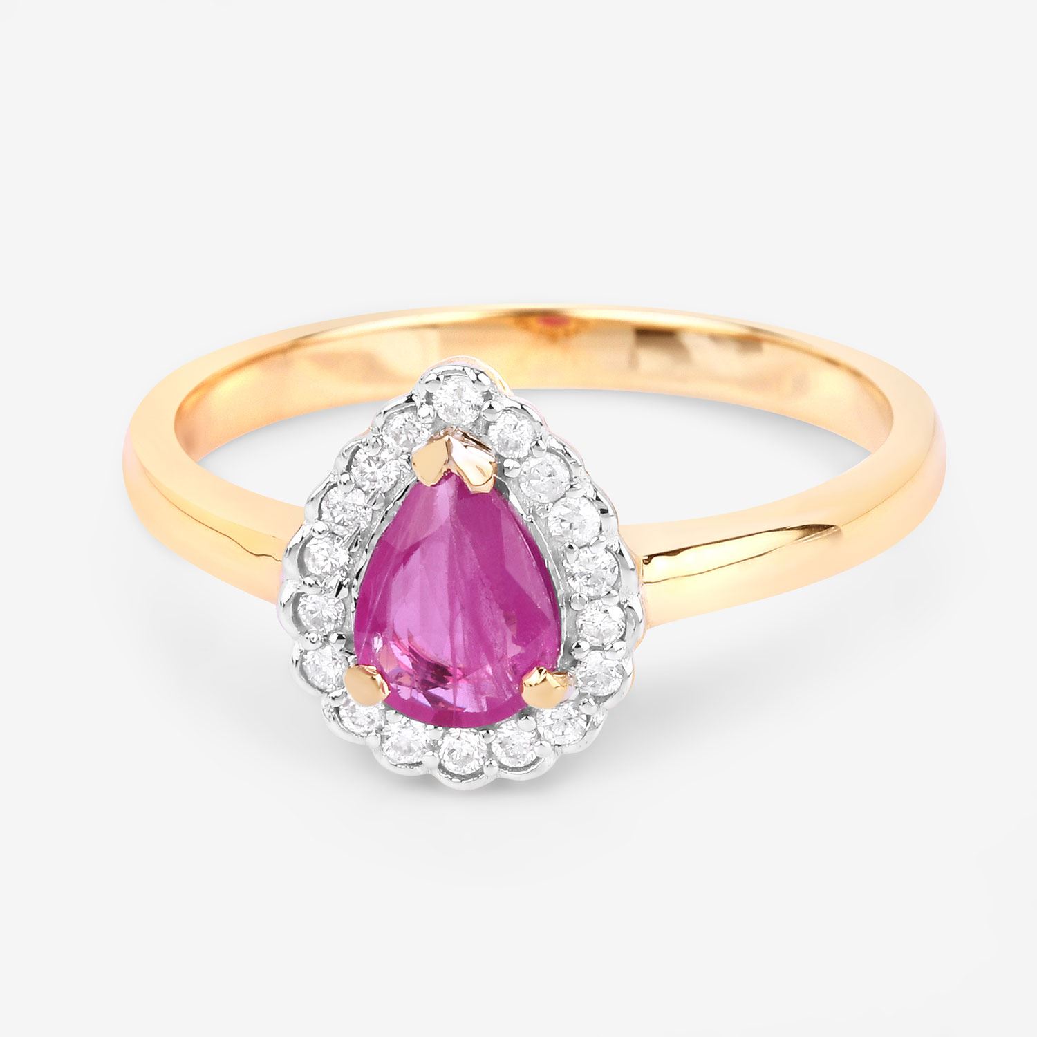 You don't have to be big to be bold. This 14 karat yellow gold ring features a stunning 7x5mm pear-cut, genuine, brazen pinkish-red .80 carat ruby*. The ruby is prong-set in a modest, but scintillating halo made of .14 carats total weight round, brilliant-cut, H-I color, I1 clarity diamonds. This ring is US size 7 with a half undergallery for support. See below for sizing options and other details. AdminCode: Q/ope