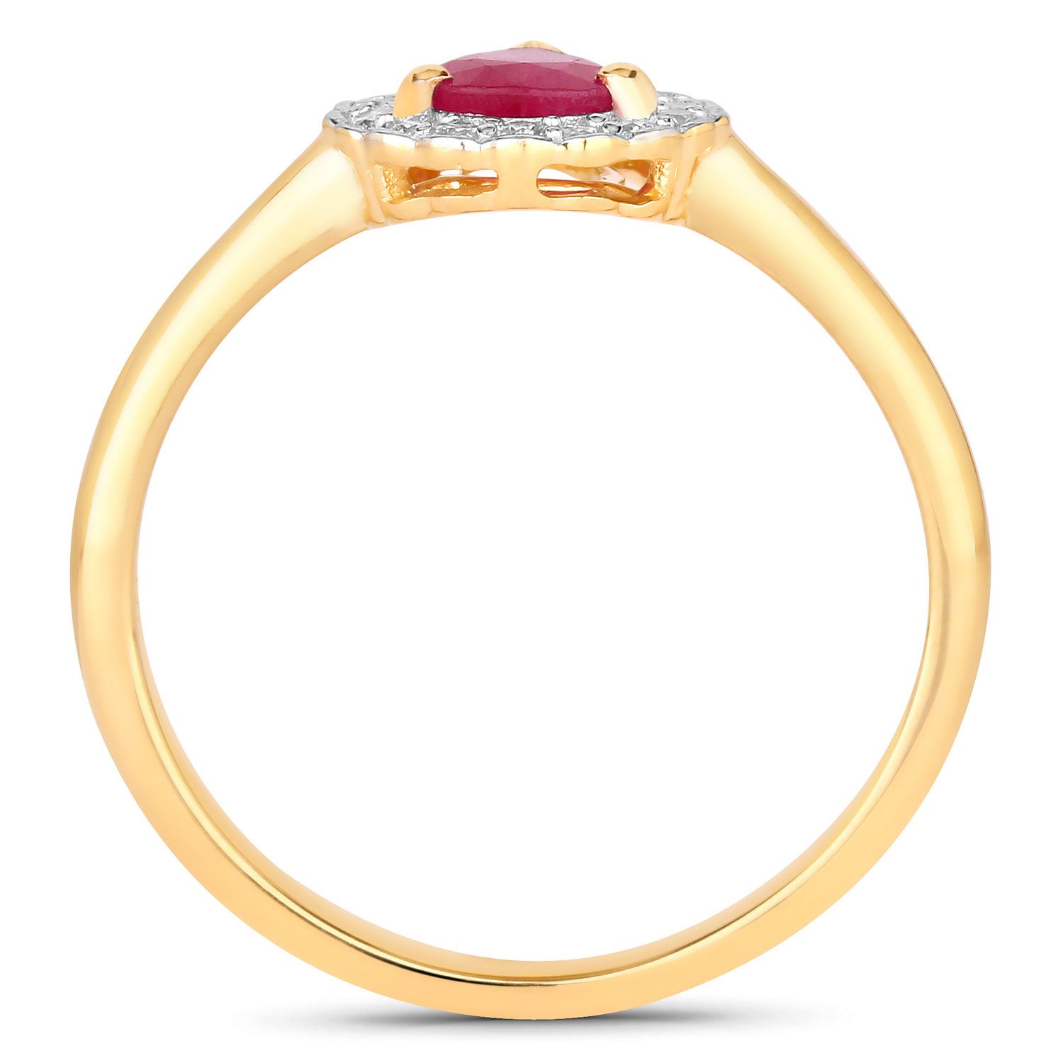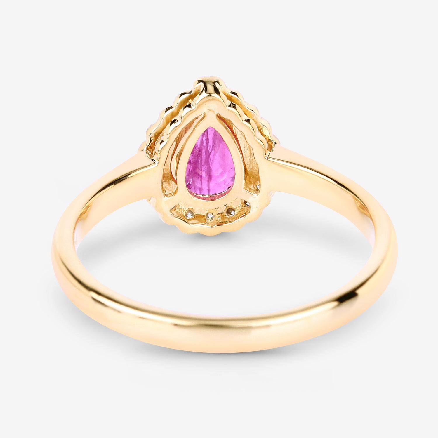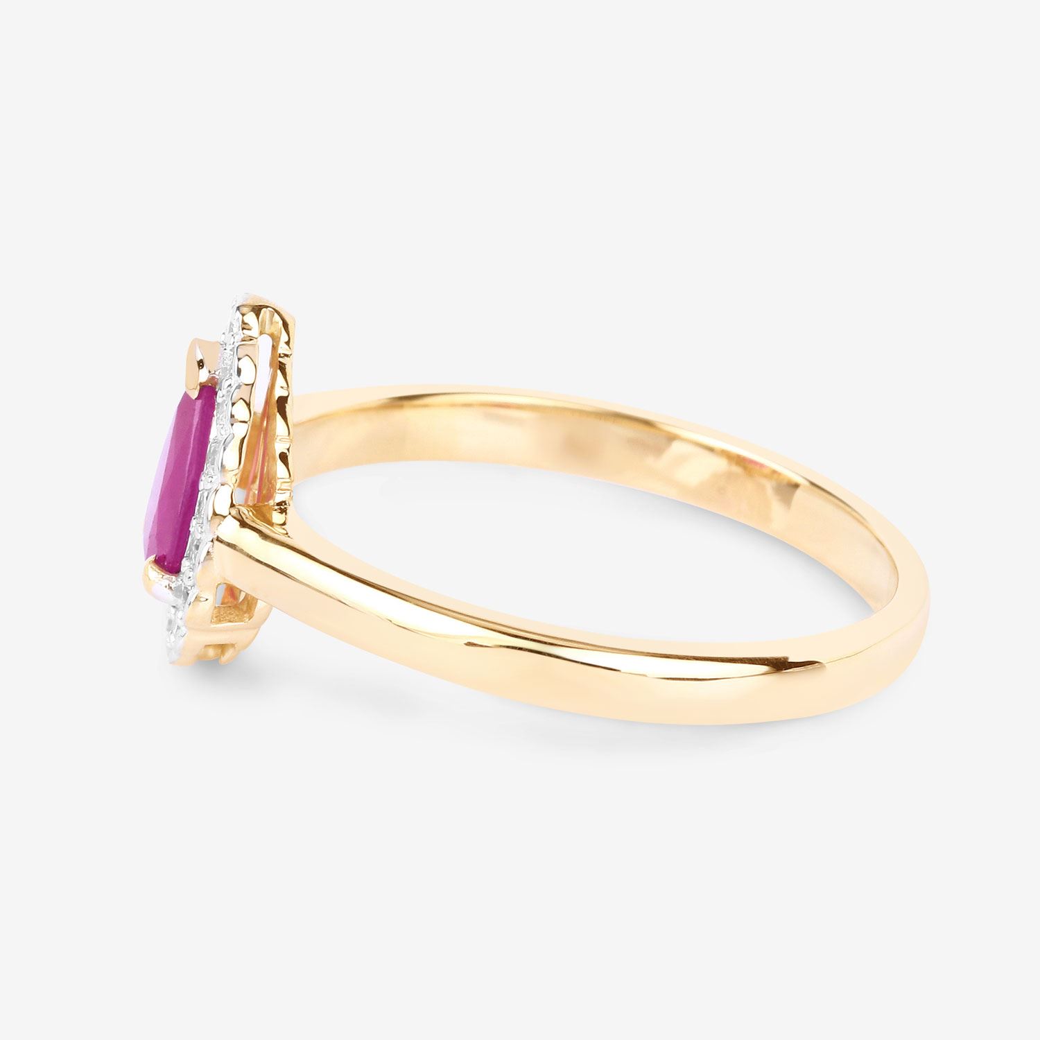 You don't have to be big to be bold. This 14 karat yellow gold ring features a stunning 7x5mm pear-cut, genuine, brazen pinkish-red .80 carat ruby*. The ruby is prong-set in a modest, but scintillating halo made of .14 carats total weight round, brilliant-cut, H-I color, I1 clarity diamonds. This ring is US size 7 with a half undergallery for support. See below for sizing options and other details. AdminCode: Q/ope
