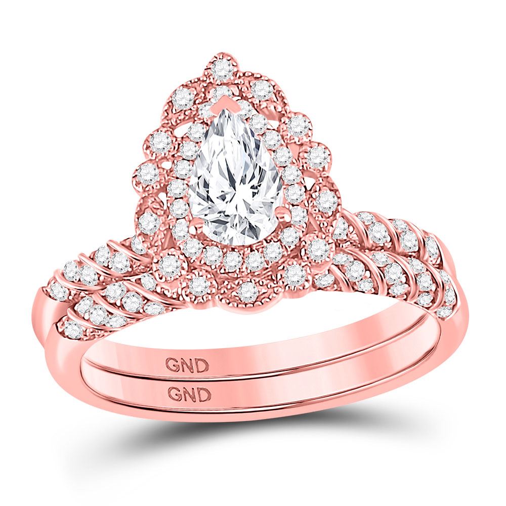 14kt Rose Gold Pear Diamond Milgrain Bridal Wedding Ring Band Set 1-1/3 Cttw