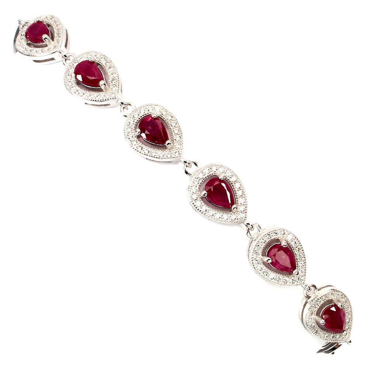 925 STERLING SILVER;PLATE-14K WHITE GOLD;LENGTH -(INCHES)8;MAIN STONE-RUBY;OTHER GEMS-CUBIC ZIRCONIA;TOTAL WEIGHT-57.36 CT (TOTAL WEIGHT OF SILVER + STONE)DIMENSION* STONE 6.0 X 4.0 MM. * CZ 1.0 MM. * FACE BRACELET 155.0 X 9.0 MM.;MAIN STONE SHAPE-PEAR CUT;MAIN STONE COLOR-TOP BLOOD RED;CLARITY/GRADE-TRANSPARENT;LUSTER-RAVISHING;TREATMENT- Yes;ORIGIN-MADAGASCAR;HARDNESS-9;