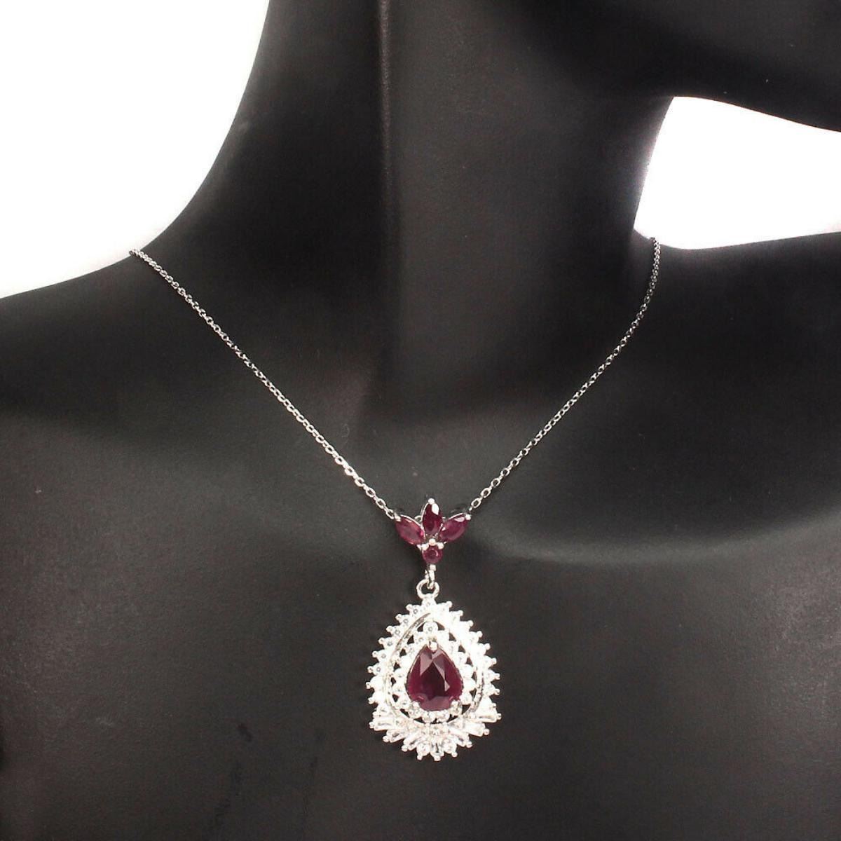925 STERLING SILVER;PLATE14K WHITE GOLD;LENGTH (INCHES)17;MAIN STONE-RUBY;OTHER GEMS-CUBIC ZIRCONIA;TOTAL WEIGHT-33.54 CT (TOTAL WEIGHT OF SILVER + STONE)DIMENSION* STONE 3.0 TO 9.0 X 7.0 MM. * CZ 1.5 TO 3.0 X 2.0 MM. * STONES PART LENGTH 36.0 X 18.0 MM.;MAIN STONE SHAPE-PEAR CUT;MAIN STONE COLOR-TOP BLOOD RED;CLARITY/GRADE-TRANSPARENT;TREATMENT- YesORIGIN-MADAGASCAR;HARDNESS-9;