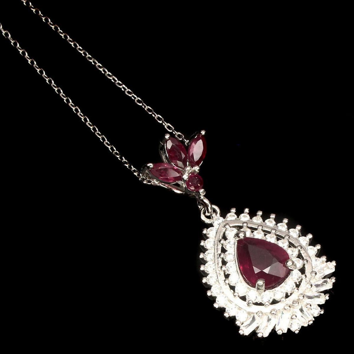 925 STERLING SILVER;PLATE14K WHITE GOLD;LENGTH (INCHES)17;MAIN STONE-RUBY;OTHER GEMS-CUBIC ZIRCONIA;TOTAL WEIGHT-33.54 CT (TOTAL WEIGHT OF SILVER + STONE)DIMENSION* STONE 3.0 TO 9.0 X 7.0 MM. * CZ 1.5 TO 3.0 X 2.0 MM. * STONES PART LENGTH 36.0 X 18.0 MM.;MAIN STONE SHAPE-PEAR CUT;MAIN STONE COLOR-TOP BLOOD RED;CLARITY/GRADE-TRANSPARENT;TREATMENT- YesORIGIN-MADAGASCAR;HARDNESS-9;