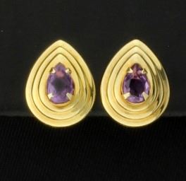 In 14K yellow gold they are 1/2 inch long and contains two 6mm pear shaped amethyst gemstones that have great color and clarity. They come with friction backs. .7g