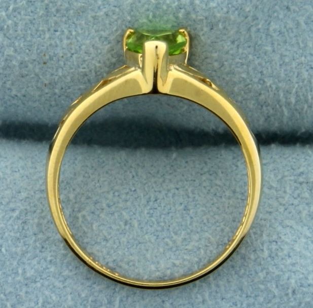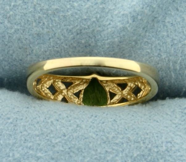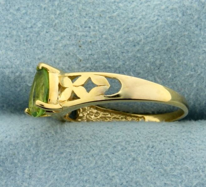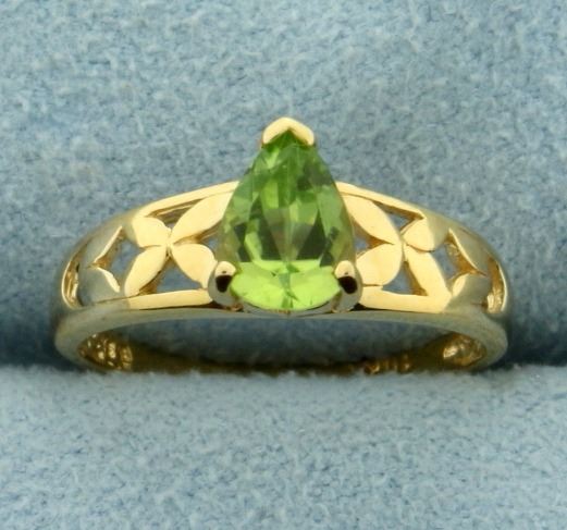 In 10K Yellow Gold. Contains one natural 7x5mm pear shaped Peridot gemstone with bright green color and excellent clarity. Size 5. 1.6g