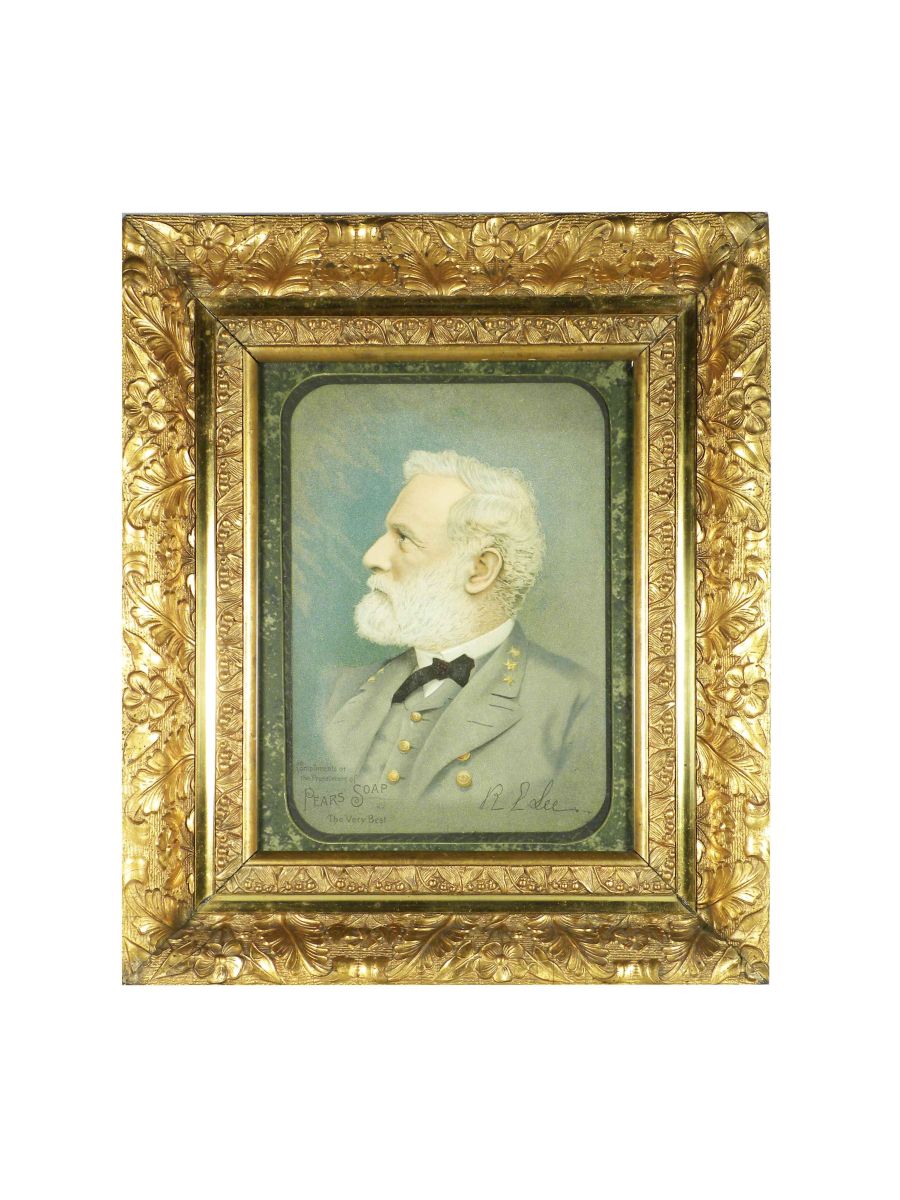 Pear's Soap Sign, depicting Robert E. Lee. Advertising on front/back. Copyright 1886. In gold gesso frame, excellent condition. 12 X 2 X 14 1/2 inches overall.