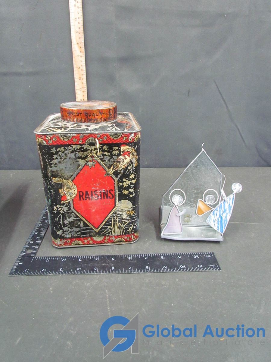 Pearks Finest Quality Raisins Tin w/ Stained Glass Decor
