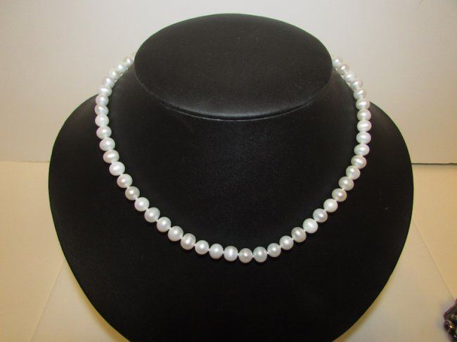 Lovely and lustrous pearl and 10k gold clasp. Measures about 17" long.