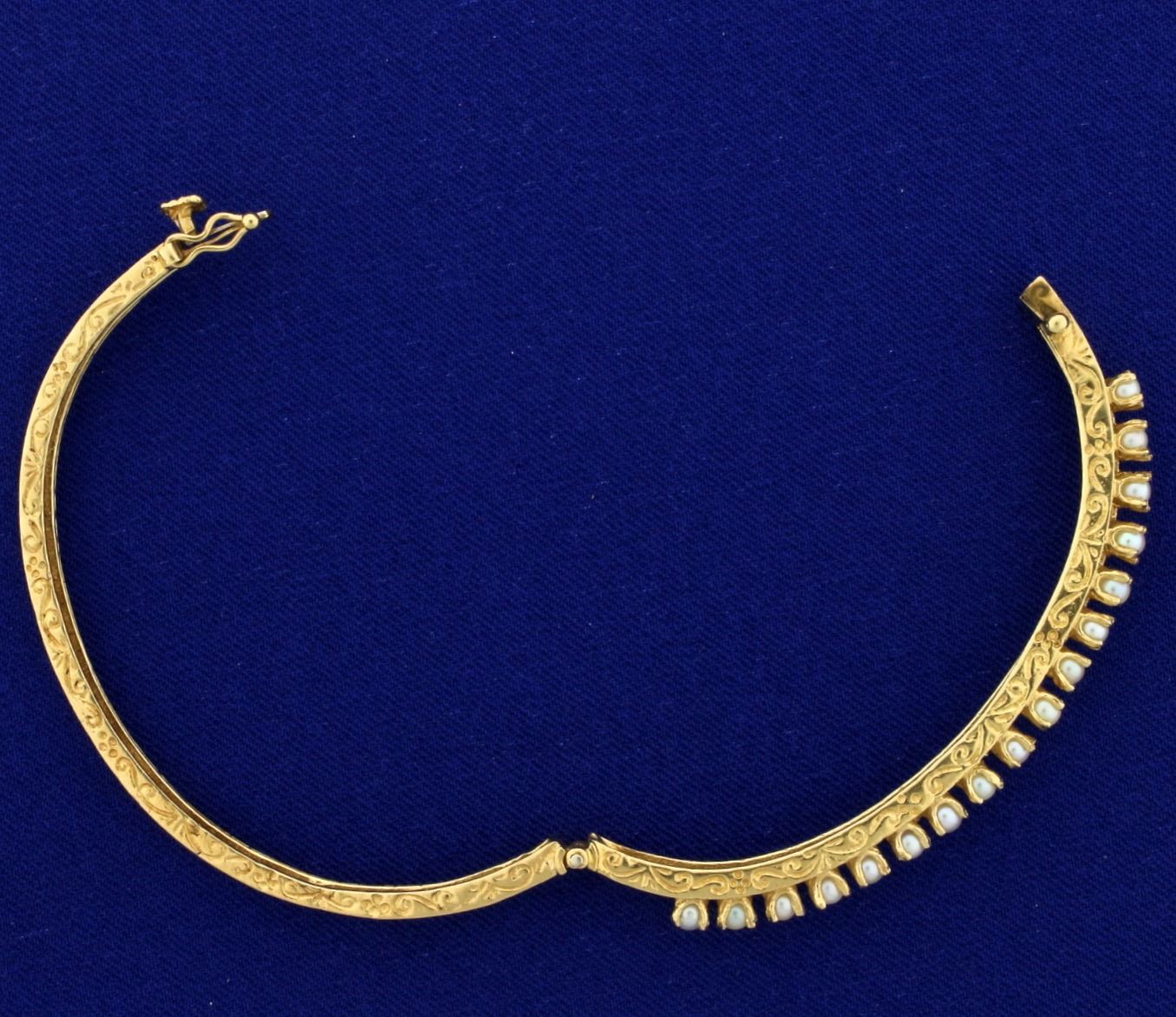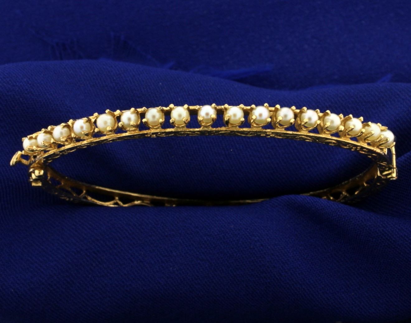 In 14k yellow gold. Contains seventeen 2.75mm high quality pearls with excellent color and luster. Intricate and unique design on bracelet. Hinges open and close for easy putting on and off. Inside diameter 2 1/2 inches with safety clasp. 10.1g.
