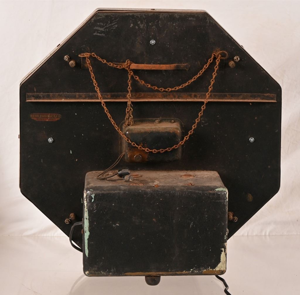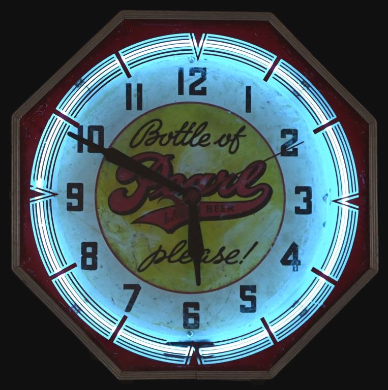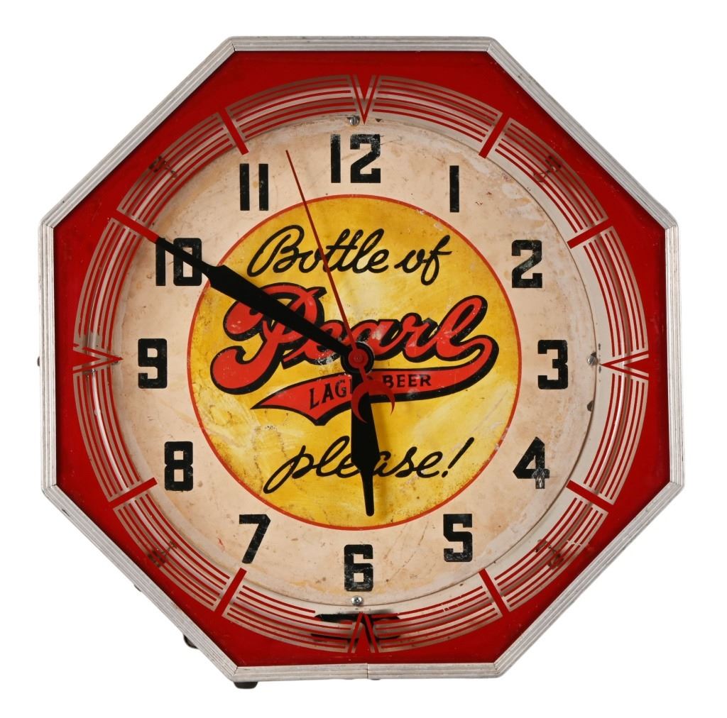 "Bottle of Pearl Please!" neon advertising clock. Working condition. Measures 7" deep, face measures 18" x 18"