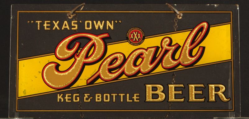 Pearl Beer Reverse Painted Glass Sign. "Texas Own Pearl Keg & Bottle Beer Reverse Painted Glass Sign. Marked Pitluk San Antonio Bottom Right Hand Corner. Measures 20" wide x 10" tall.