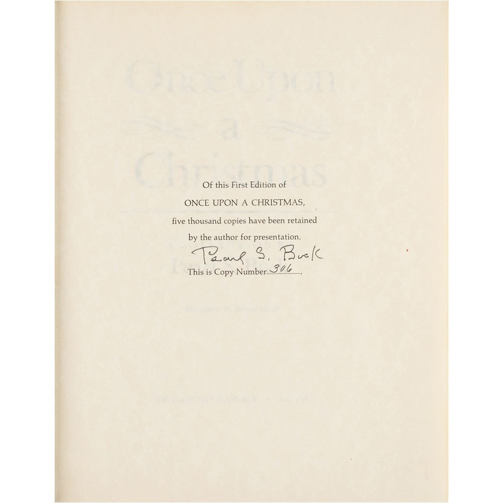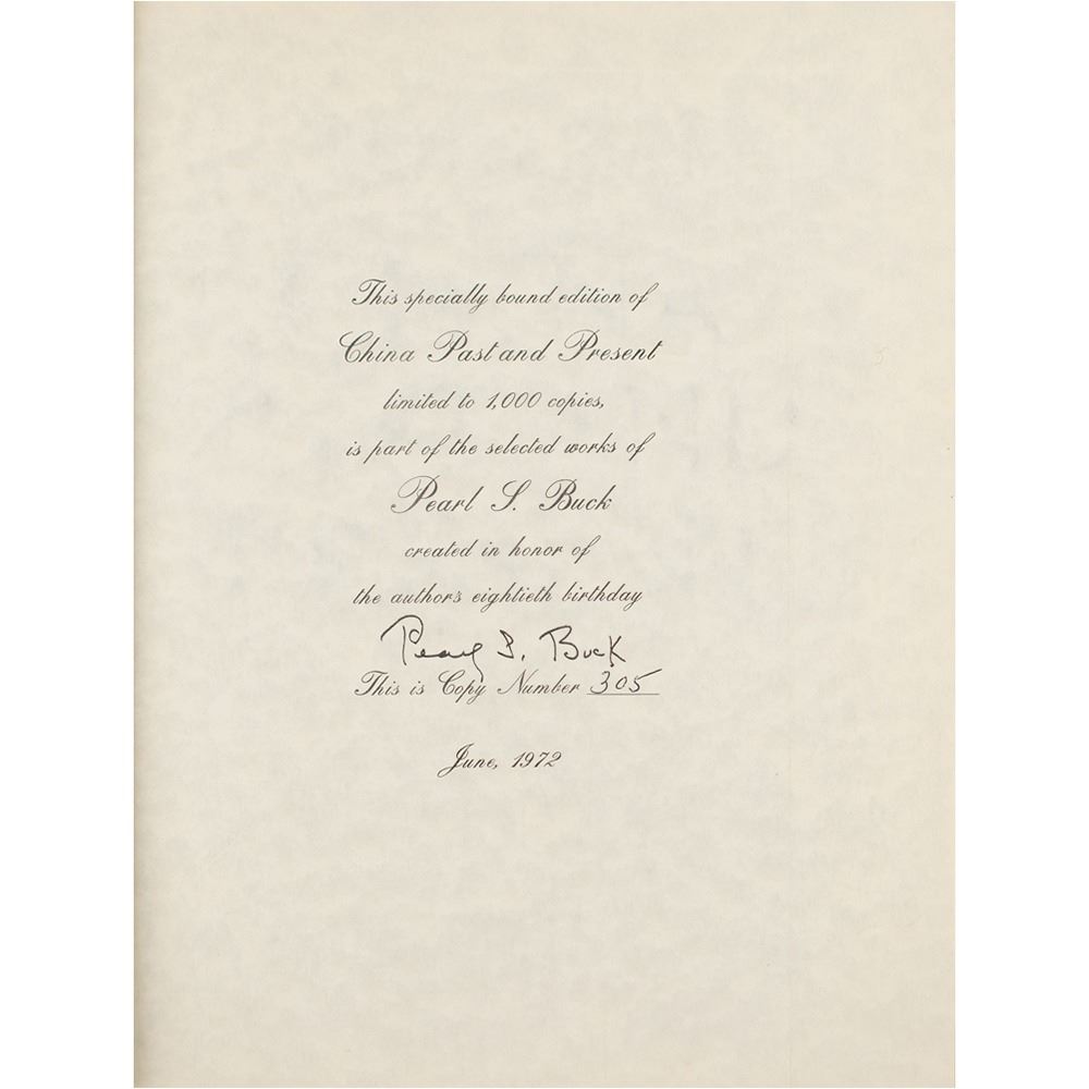 Two limited edition signed books, both hardcovers with dust jackets: China: Past and Present, published by The John Day Company in 1972, numbered 305/1000, signed on the colophon in black felt tip, "Pearl S. Buck"; and Once Upon a Christmas, published by The John Day Company in 1972, numbered 306/5000, signed on the colophon in black felt tip, "Pearl S. Buck." In overall fine condition, with price-clipped dust jackets. Illustrated with images captured by great Magnum photographers like Henri Cartier-Bresson and Marc Riboud, paired with Buck's commentary, China: Past and Present is a work of particular significance.
