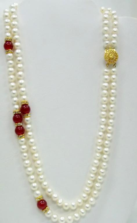 This gorgeous set includes a 16" double strand necklace made of 8mm fresh water pearls with carnelian and roundell accents. The matching bracelet is 7.50". The retail value is $1220-.