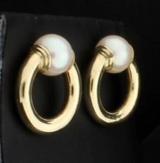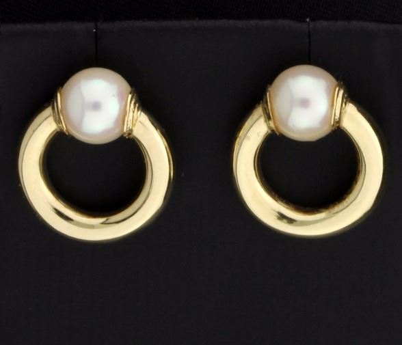 In 14K yellow gold, they contain two 7.4mm round pearls with great color and luster. They are 3/4 inch long and have friction backs. 2.6g