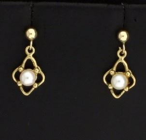 In 9K yellow gold they are about 1/2 inch long and have two 3.7mm round pearls. They have friction backs. 1.0g