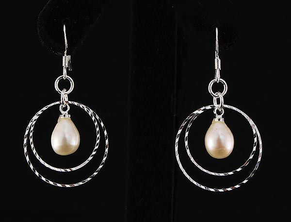 Pearl Dangling 3.25g Diamond Cut Design Silver Earring **|**|** 1.65 Inches Long Round Dangling Hook Earring with White Color Freshwater Pearls 7-8mm in Size ; MSRP: $100