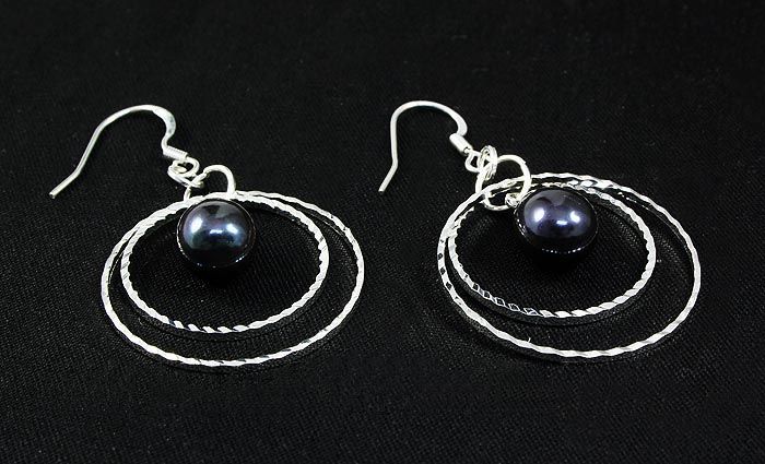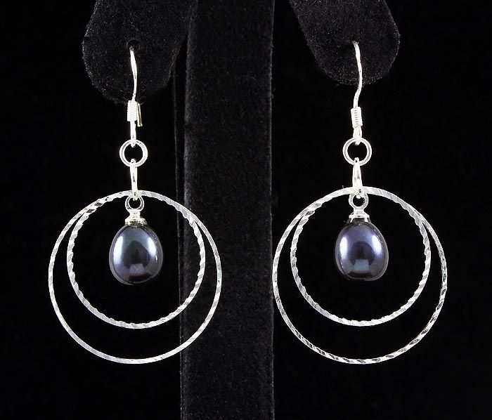 Pearl Dangling 3.67g Diamond Cut Design Silver Earring **|**|** 1.75 Inches Long Dangling Hook Earring with Black Color Freshwater Pearls 7-8mm in Size ; MSRP: $100