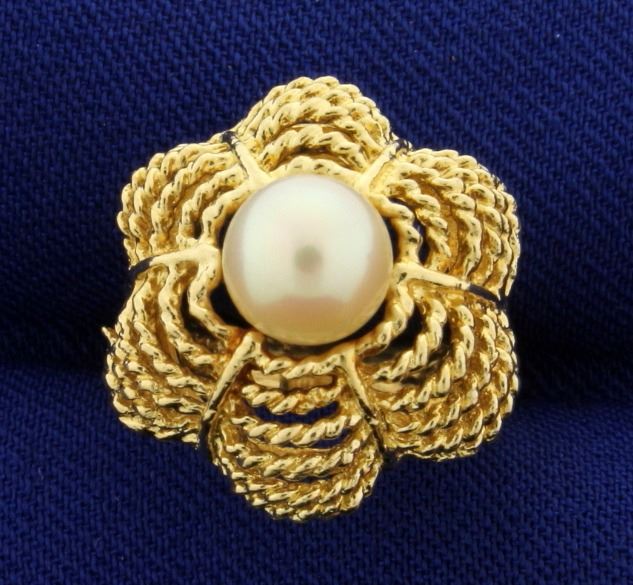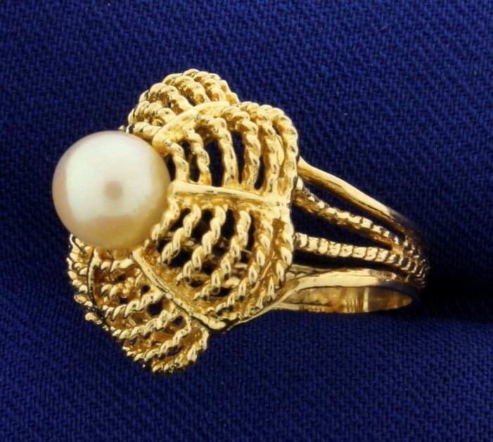 In 14k yellow gold, contains a 6.6mm pearl with excellent color and luster. Unique design. Size 2 3/4. 4.2g.