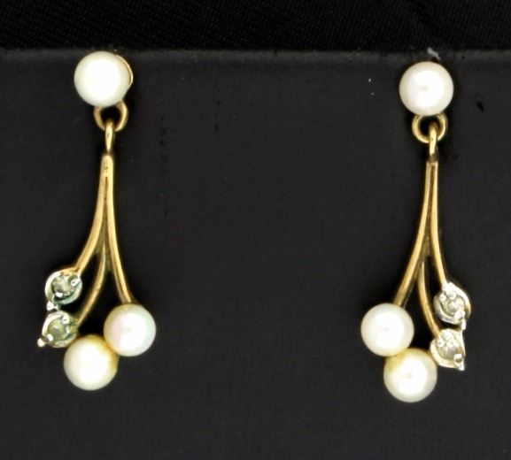In 9K yellow gold they are 1 inch long and each earring contains three 3.5mm pearls and two 1/2pt diamonds. They have friction backs. 1.6g