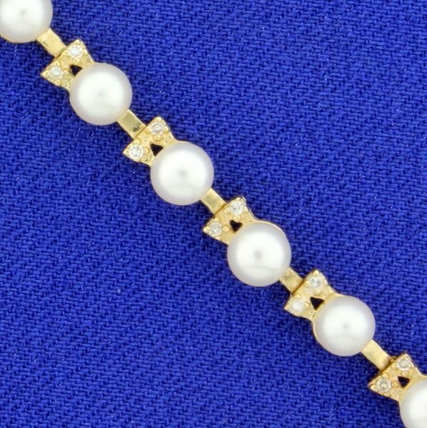 In 14K yellow gold, it is 7 1/2 inches long and has a lobster clasp. There are twenty two 4.4mm pearls and forty four 1/2pt diamonds. 7.0g
