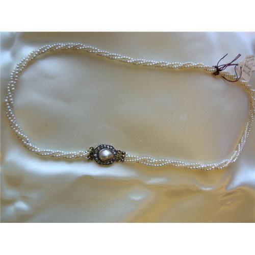 Victorian seed pearl multi strand necklace with diamond and Abalone pearl clasp. This is an all original pearl necklace dated to be between 1820-1840 era. The diamonds on the clasp are all French Old Mine Cut (Cardinal Masseria Cut) diamonds, approximately .55 CT weight. Clasp is 18KT Yellow gold with diamonds set in Sterling silver. This is very typical in this era as there was no white gold till 1918. Pearls have been all restrung. Necklace measures 16.5" long.We can restring necklace to custom fit your neck if you need a smaller size.
