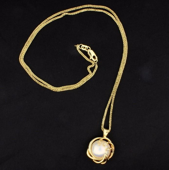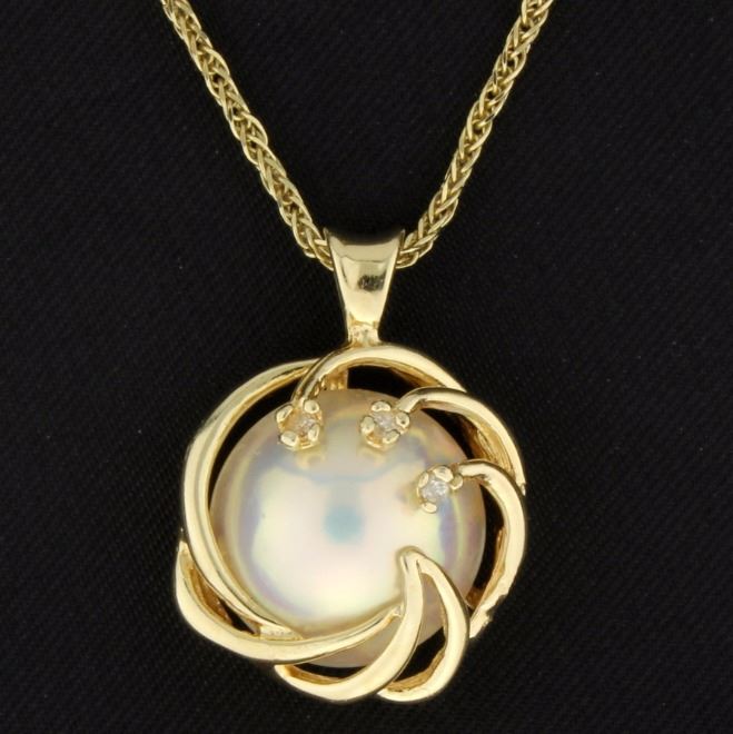 In 14K yellow gold, the pendant is 7/8 inch long and contains a 12.4mm pearl with exceptional luster and color and three .01ct round diamonds. This pendant is on a 18 1/4 inch chain that has a lobster clasp.           5.4g