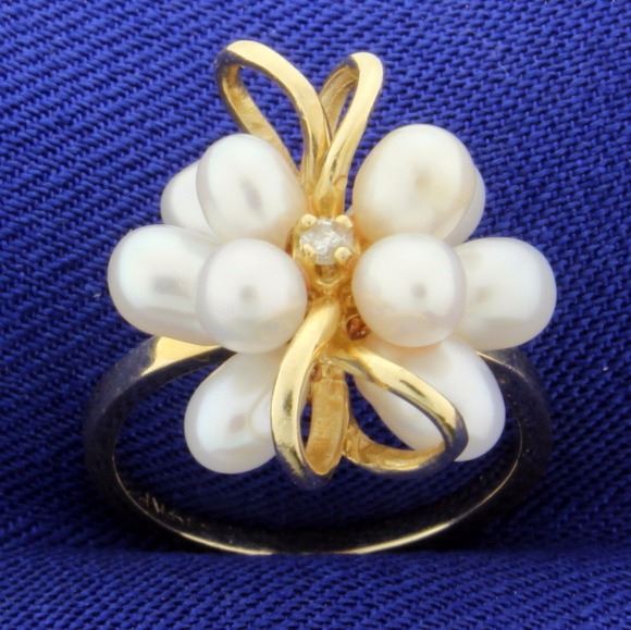In 14K yellow gold, there are ten drop shaped pearls and one .02ct round diamond. Size 3 3/4         3.2g