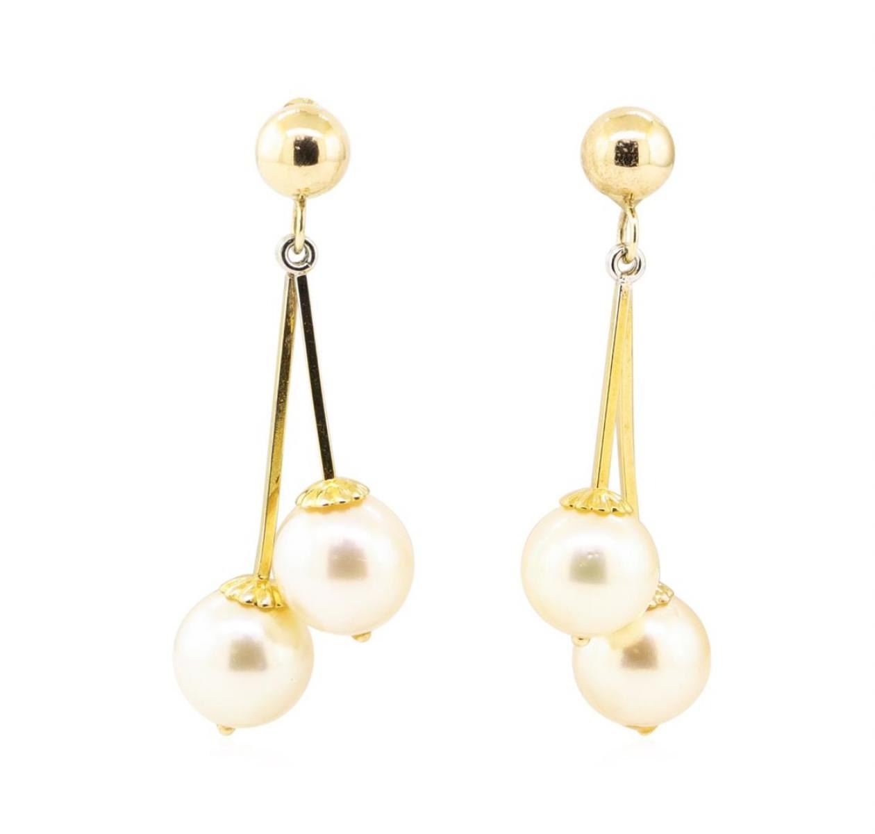 One pair of double dangle earrings with a drop of 40 millimeters featuring: 14KT yellow gold weighing 5.4 grams containing four pearls measuring approximately 8.50 millimeters wide.