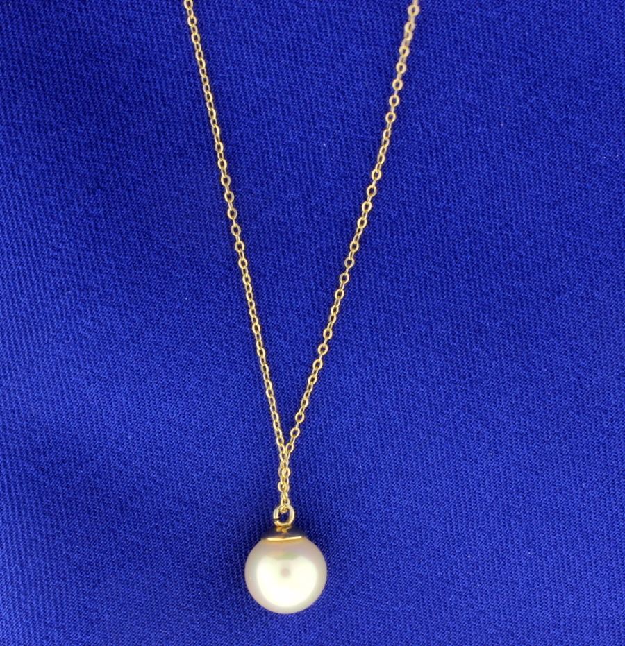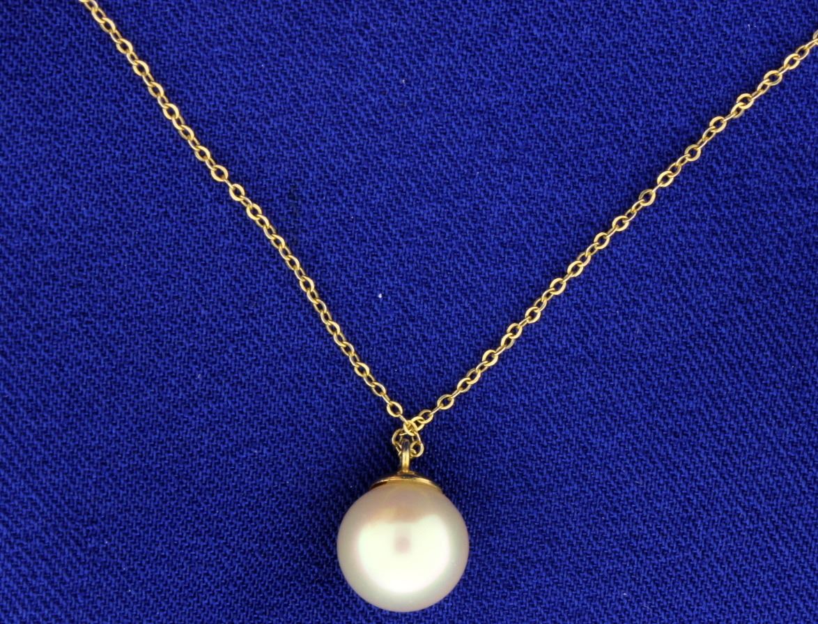 In 14k yellow gold this necklace is 15 inches long and has a 9mm cultured pearl with excellent color and luster.    2.0g