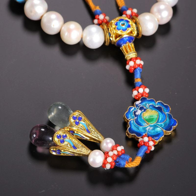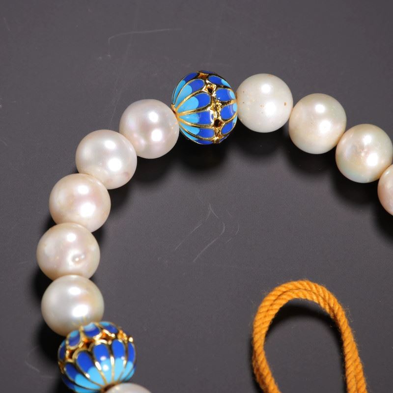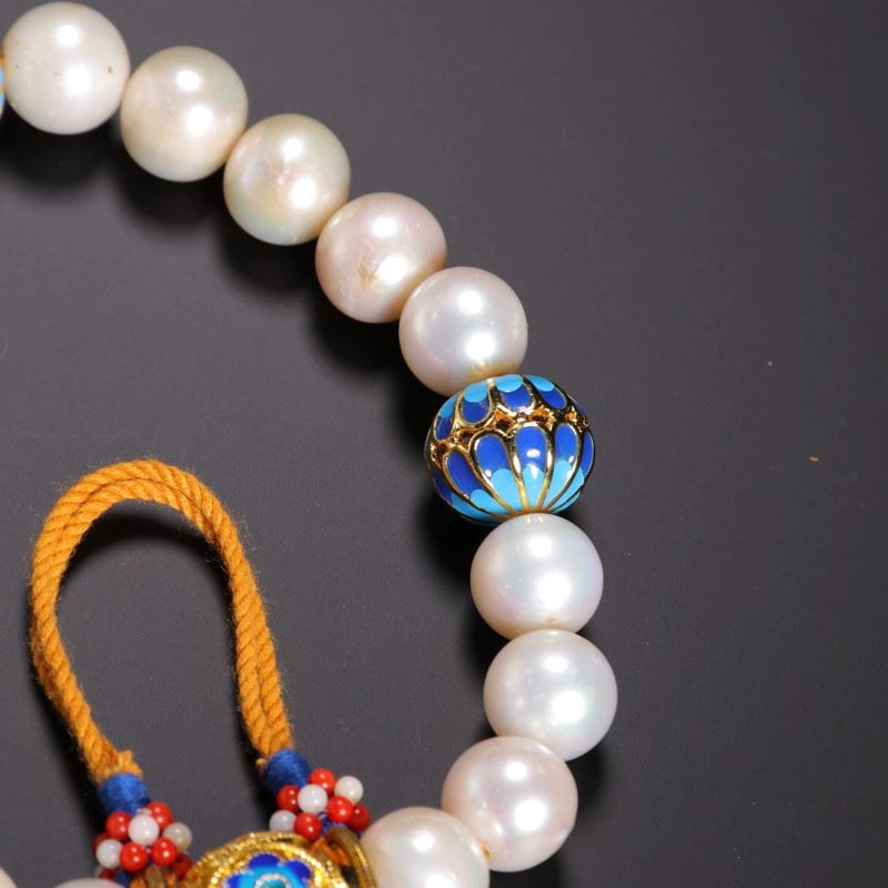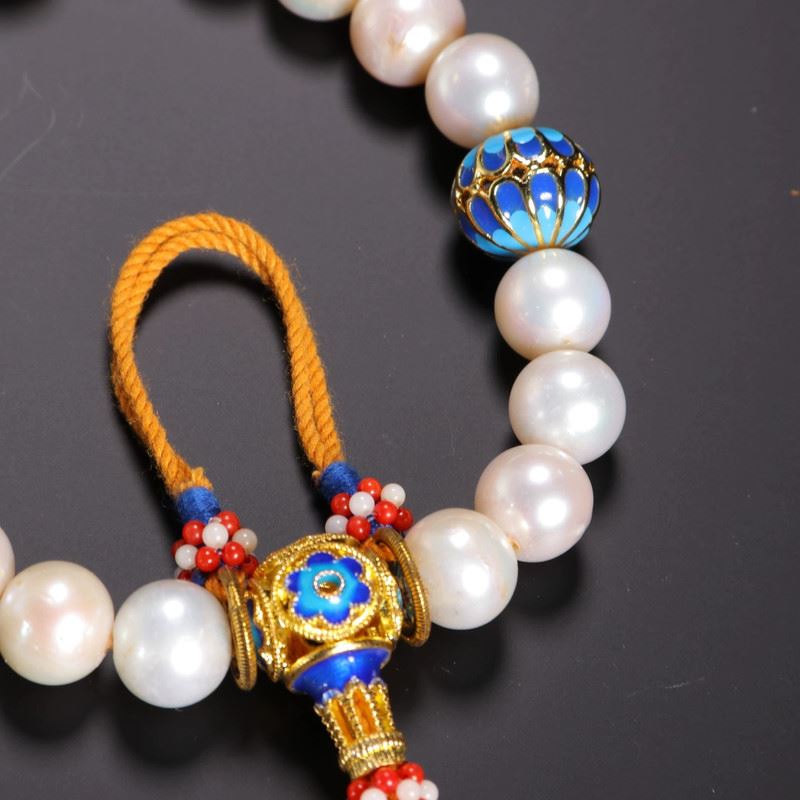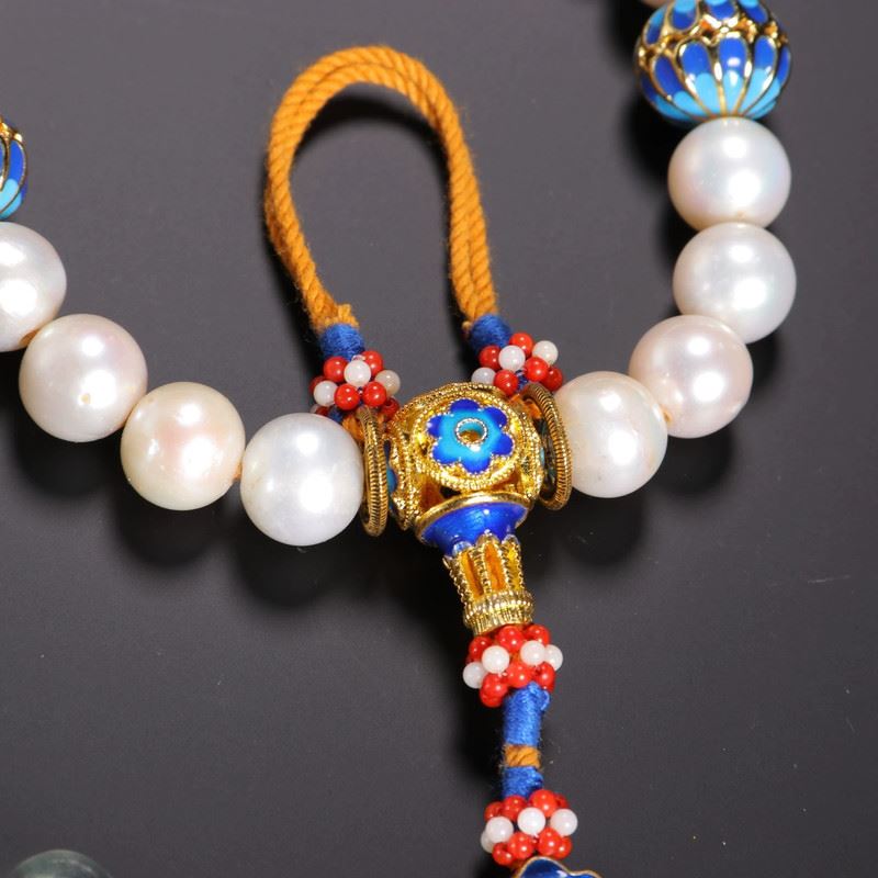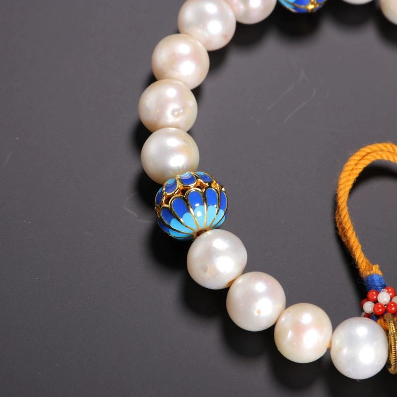 This pearl eighteen beads handheld ornament is made up of eighteen exquisite pearls, perfectly combining elegance and refinement. Each pearl is smooth and round, with a soft luster that showcases the beauty of nature. The design is inspired by traditional jewelry artistry, with the handheld section meticulously crafted to highlight the rich cultural heritage and aesthetic craftsmanship. This ornament is not only a pursuit of beauty but also a tribute to the legacy and promotion of traditional handcraft techniques.
