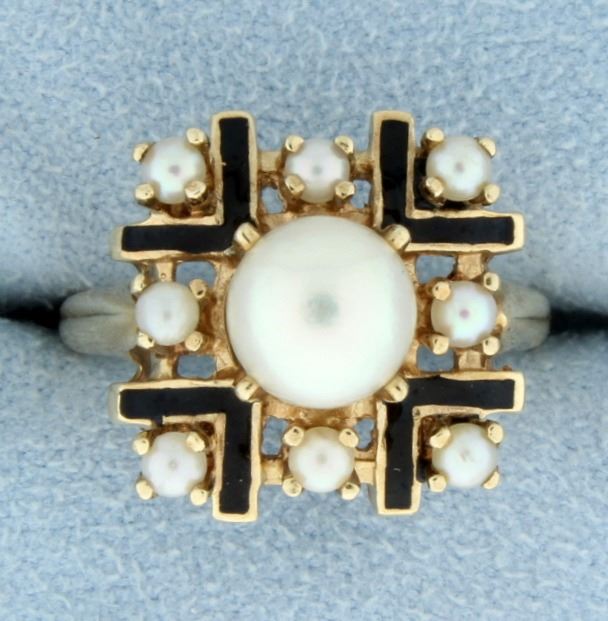 14K yellow gold, there is a 7 mm pearl & eight 2.5mm pearls-all great luster! Black enamel, Size 7 1/2 5.6g