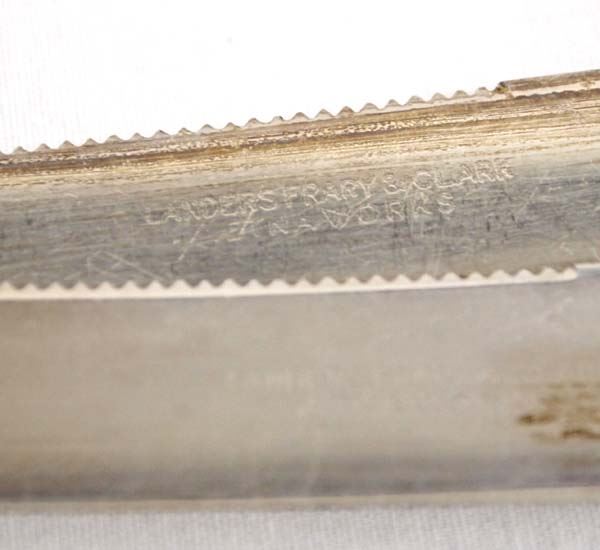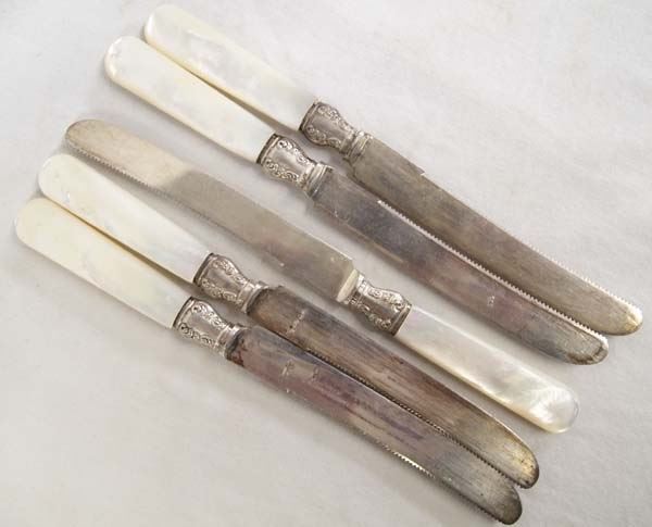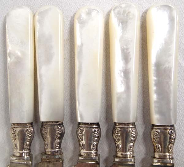 1900's Antique Pearl Handled Landers, Frary, & Clark Fruit Knives, set of 5, measure 5 7/8''L, silverplated blades, Rose Sterling Ferrules, blades are stamped
