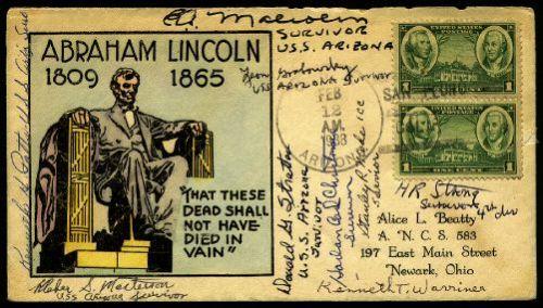 Pearl Harbor. Group of eight postal covers, postmarked 1932-41, signed variously by officers and survivors of the Arizona (two), Nevada (two), together with unsigned covers of the Utah, Whippoorwill, George F. Elliot, and vintage postcard of "Two-Man Japanese Submarine." In all, 23 signatures on covers, including Congressional Medal of Honor winner Donald K. Ross, Vice Adm. Kleber S. Masterson (a Lieutenant on the Arizona on Dec. 7, 1941), Commander Everett A. Malcolm, and numerous survivors. Each cover with cachet. Request detailed list. Fine to very fine.