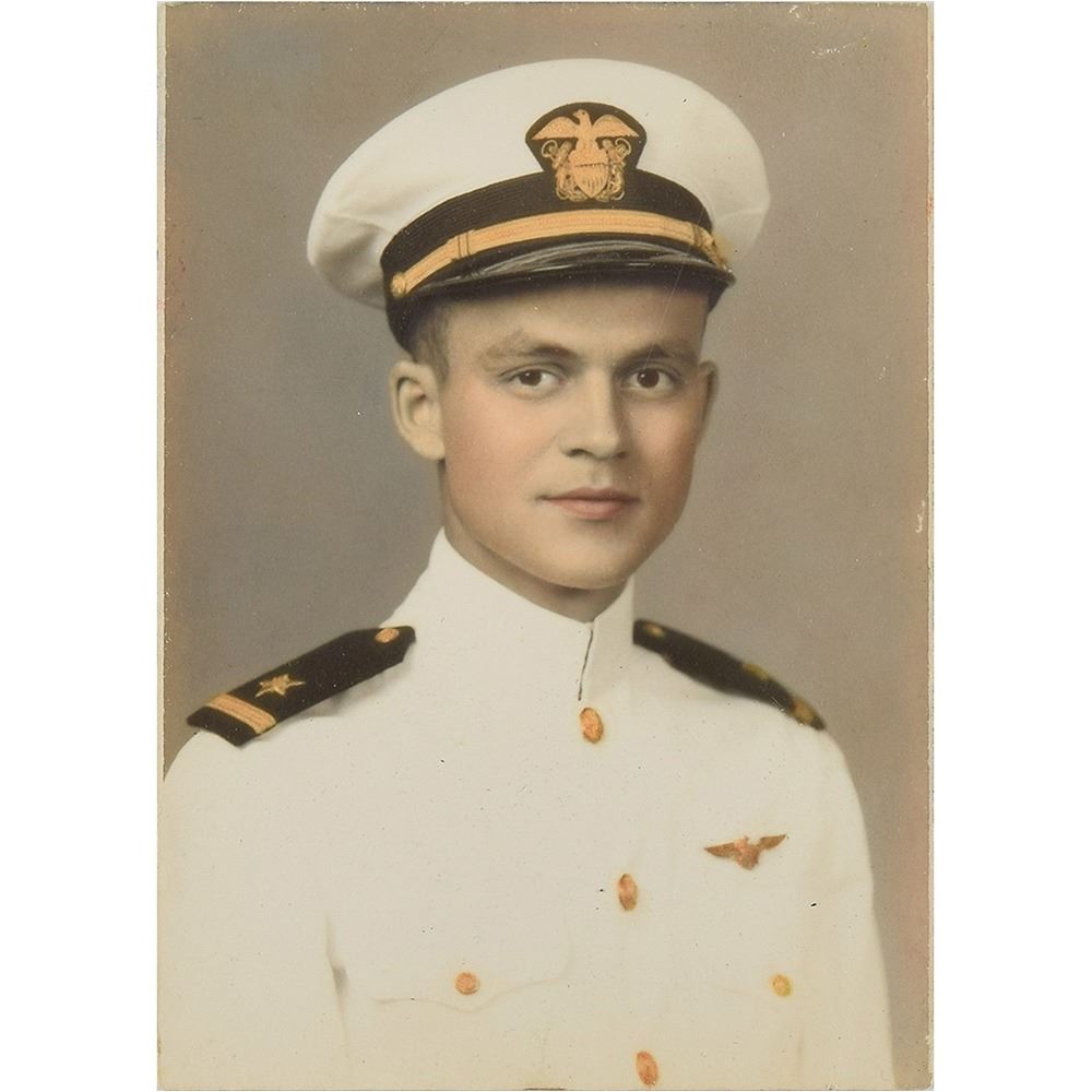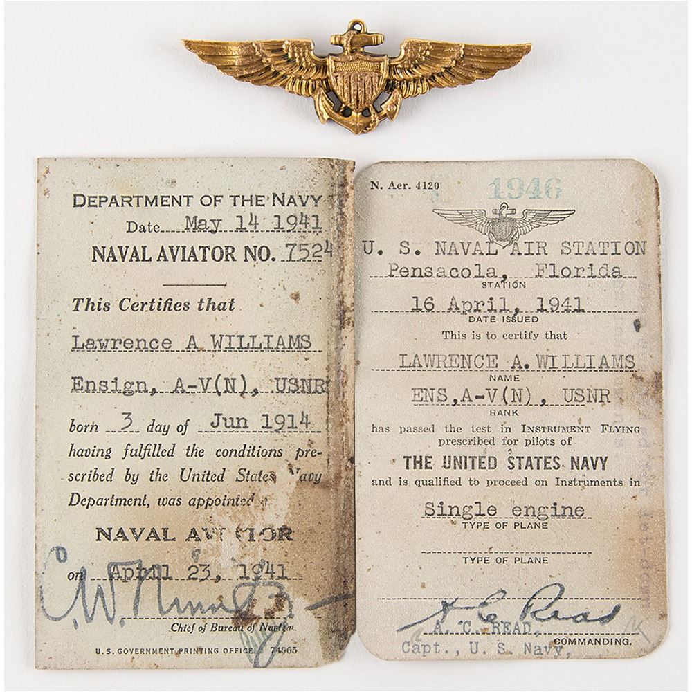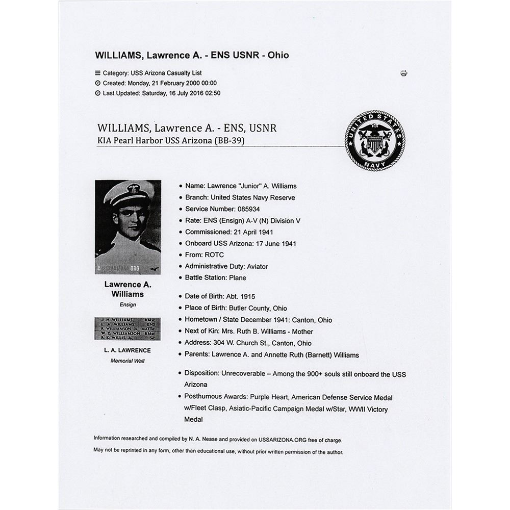 Williams was born in Ohio on June 3, 1914, to Lawrence W. and Ruth Williams of Oxford Township. Williams attended Miami University (Ohio) School of Architecture and graduated in June of 1936 with a B. Arch. He began his career as an apprentice soon afterward, while also working in a local hardware store as an electrician (his pre-military career is listed in a handwritten letter he wrote to accompany his application for naval flight training, and a copy is included with the lot). He initially enlisted as a Seaman, 2nd Class in the US Naval Reserves in May of 1940, and was subsequently discharged on October 3, 1940, in order to report for training as a Naval Aviation Cadet at NAS Pensacola, Florida. Williams successfully graduated 42nd in his class as a full-fledged Naval Aviator and was commissioned an Ensign on April 21, 1941. He was assigned to Observation Squadron 1 (VO-1) and billeted aboard the USS Arizona (BB-39), flying a Vought OS2U ‘Kingfisher’ floatplane (reg. no. 1-0-3). He was killed when Arizona’s forward magazine exploded during the surprise Japanese attack on December 7, and his remains were deemed ‘not recoverable.’
