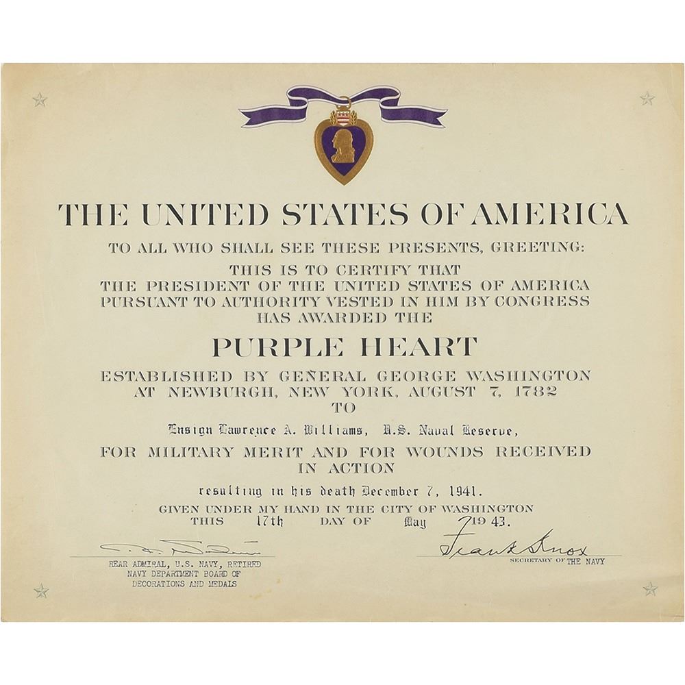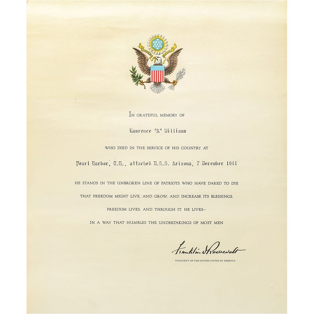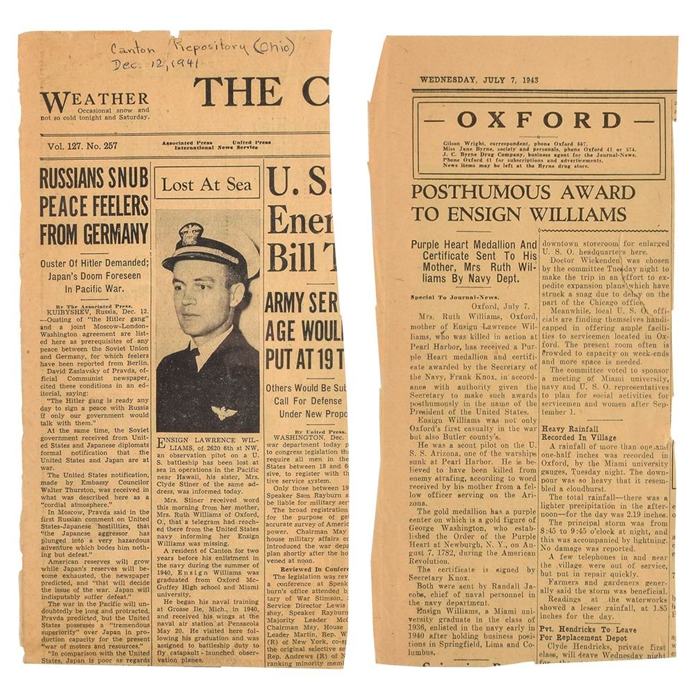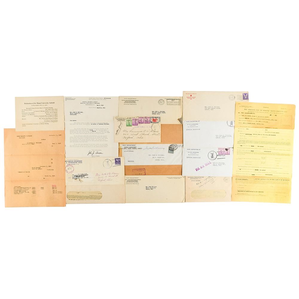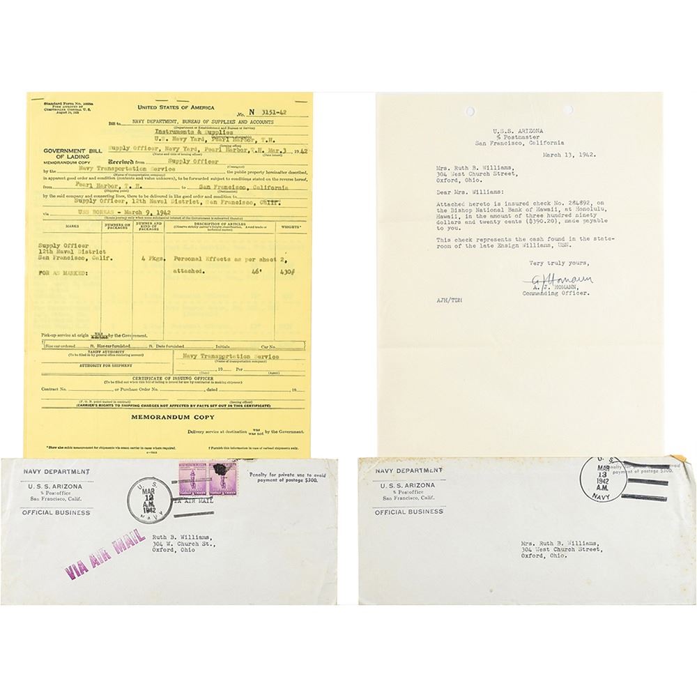 Spectacular lot of documents and recovered personal effects belonging to Ens. Lawrence A. Williams, who was killed aboard the USS Arizona during the attack on Pearl Harbor.