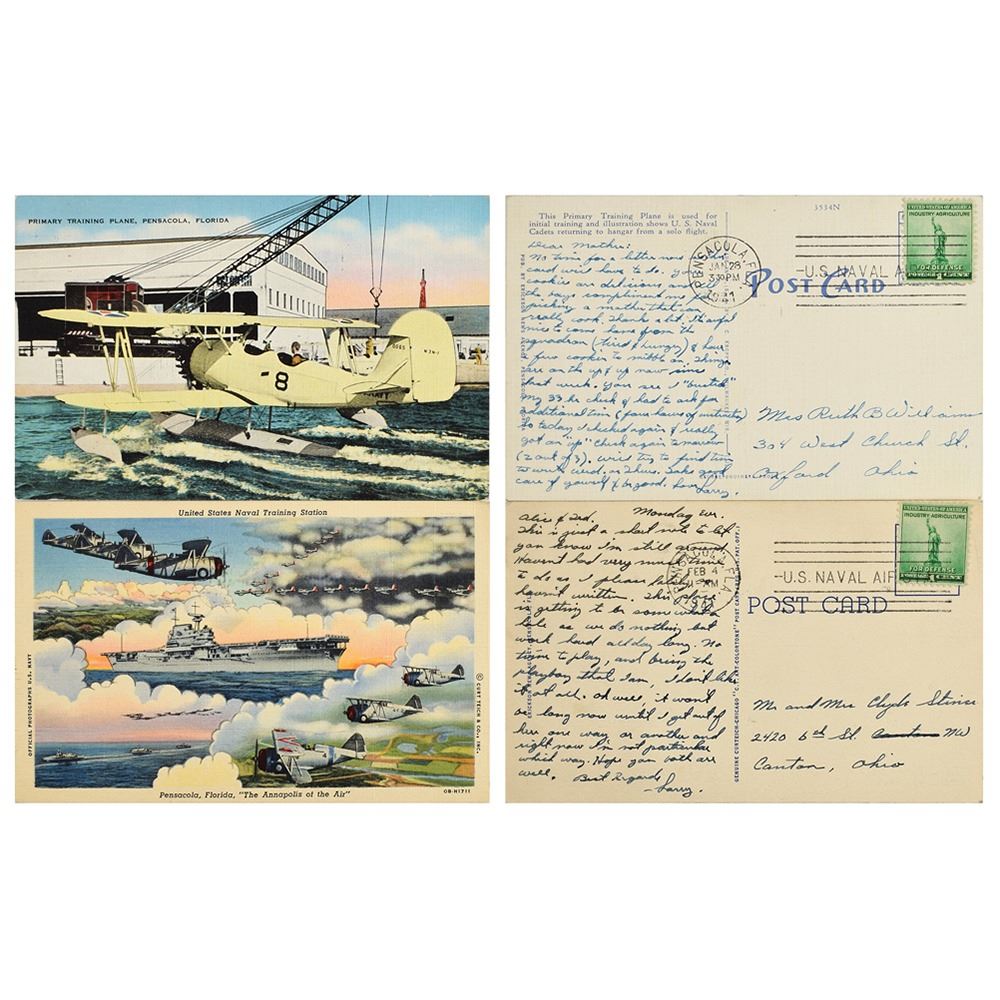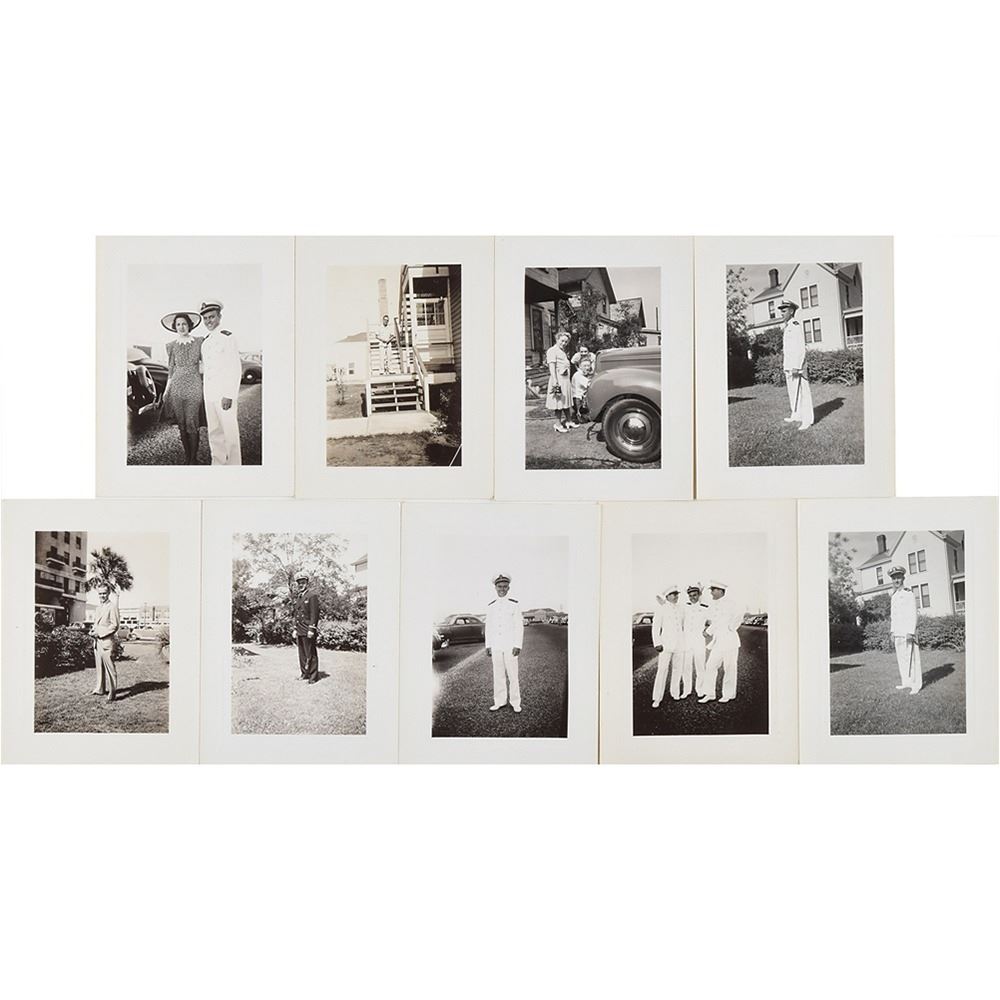 Several photographs are included in the lot, including his hand-tinted commission portrait, a pre-military portrait in civilian attire, and eight snapshot photos with notations; mostly of his graduation at Pensacola, as well as with his family in Ohio, and one with his fiance. Several National Archives copies of his training and assessment forms while at Pensacola are also included.