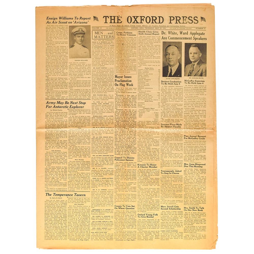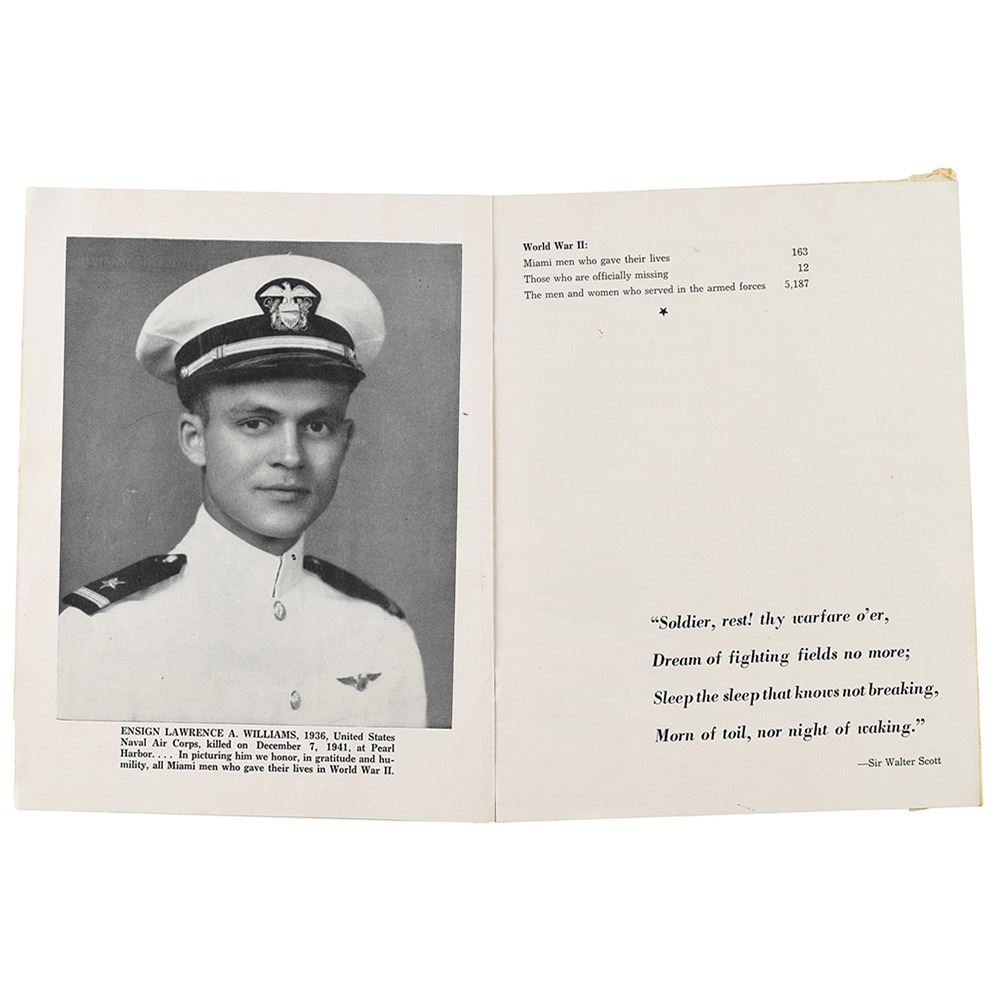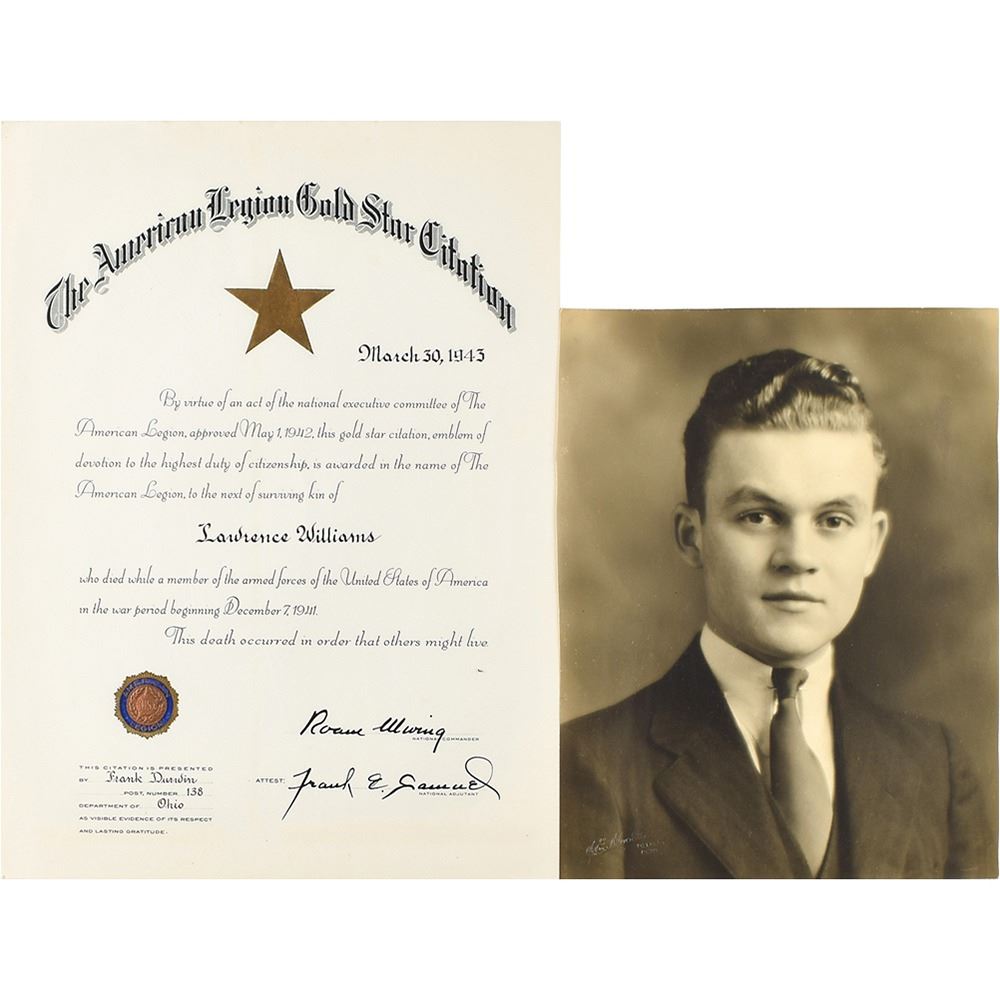 Several post-war items are also included: a 1946 Miami University Bulletin detailing the school’s wartime activities and alumni who gave their lives during the fighting (Williams’ full-page portrait as the first to be killed is on page 2), a small sheet for the dedication of the Lawrence A. Williams building at the Miami University Airfield, and an American Legion Gold Star Certificate issued to Williams’ mother on March 30, 1943. Also included in the lot are several Ohio newspapers and clippings related to Williams’ posting to Arizona, as well as the Pearl Harbor attack, and his death. This is a comprehensive grouping that details the short military career of a life full of promise, cut down in one of the most historically significant events in U.S. and world history.