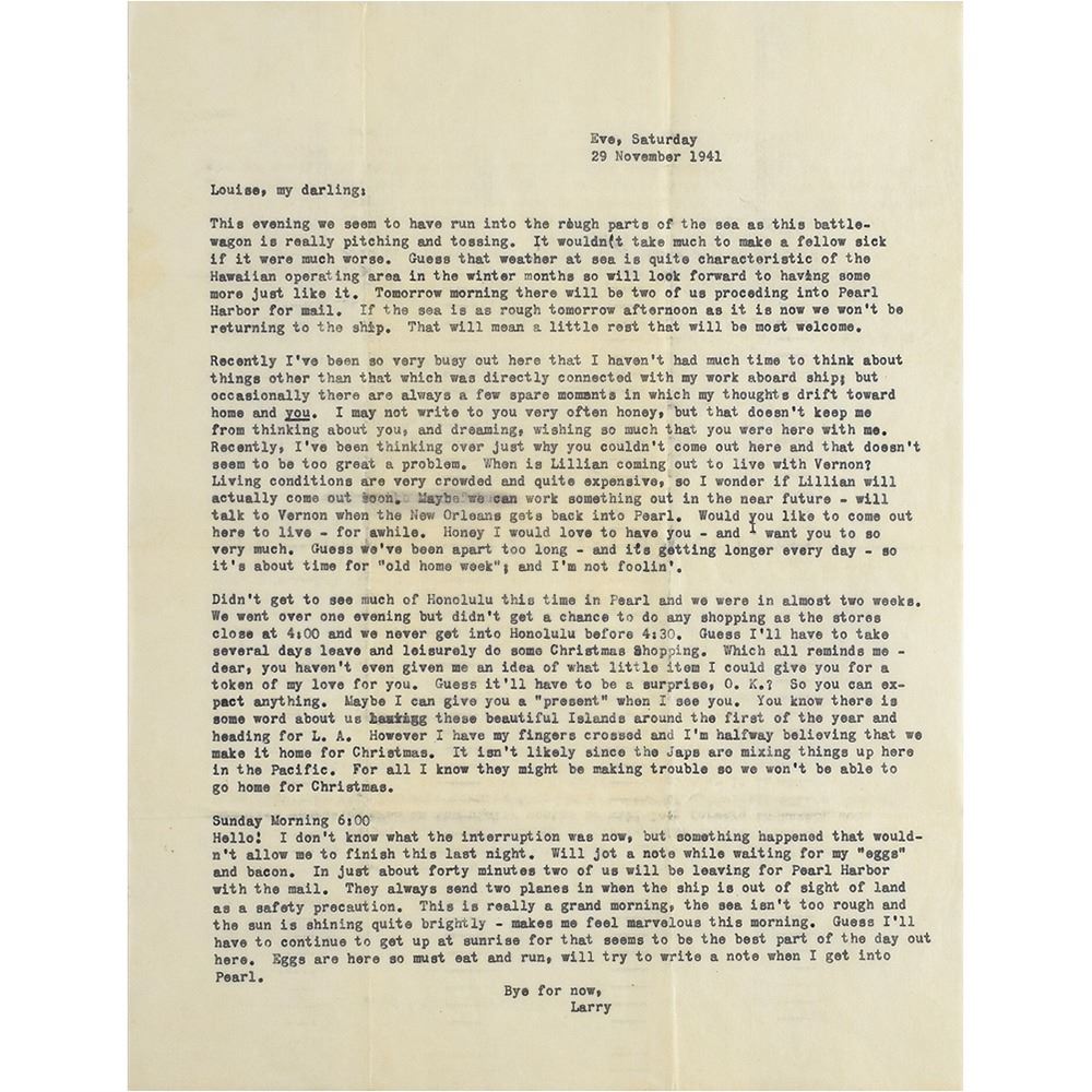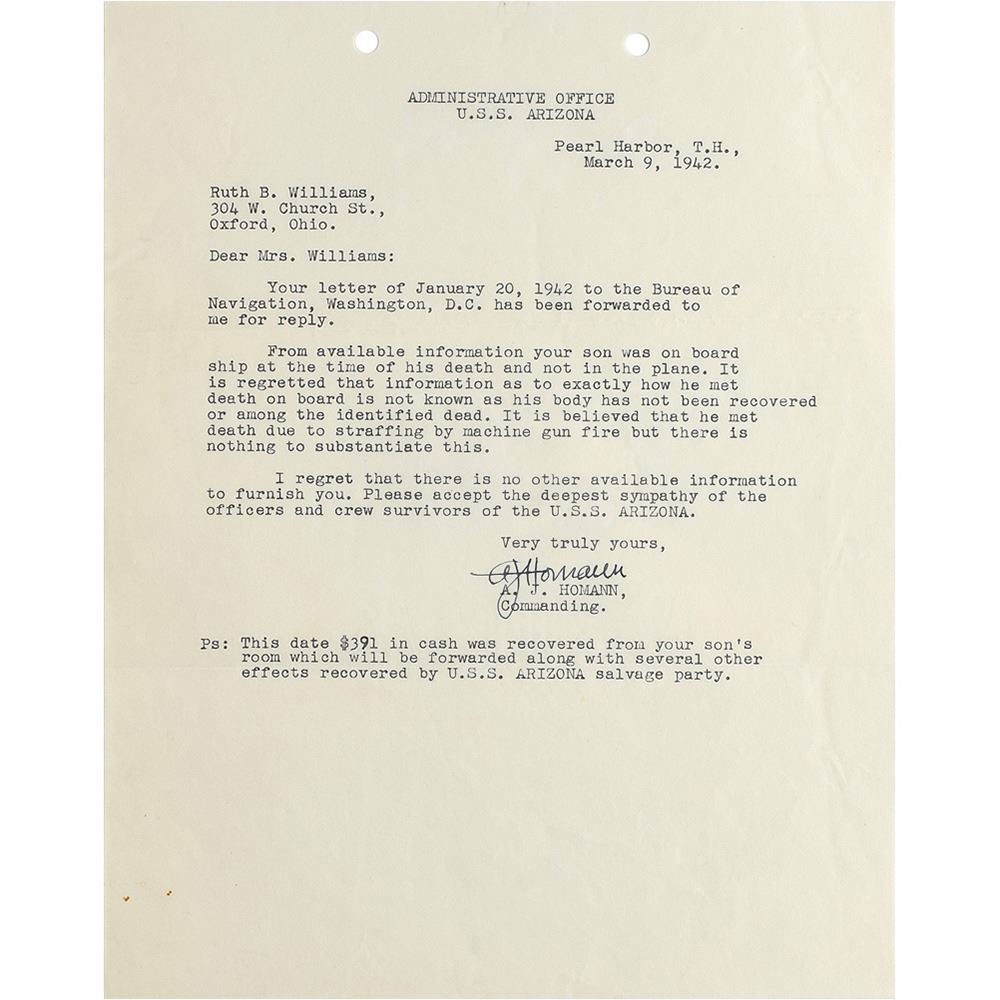 Williams reported for duty aboard USS Arizona (BB-39) on June 17, 1941. According to a shipboard fitness report (a copy of which is included), he initially found life aboard ship to be a difficult adjustment, but had made significant improvement in his outlook over time. His last letter to his fiance, dated November 29, makes mention of having to look at his “stupid†shipmates around the clock, but that he hoped to rate a private room shortly (a typewritten transcript of this letter is included).